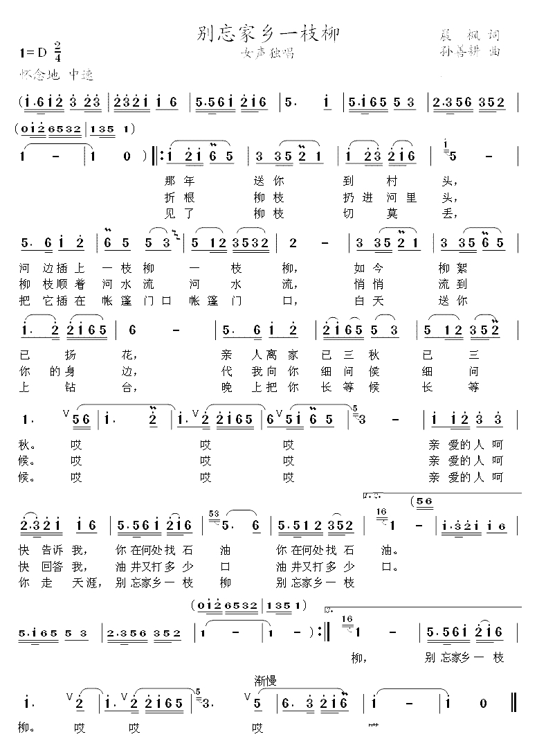 别忘家乡一枝柳简谱-陆青霜演唱简谱