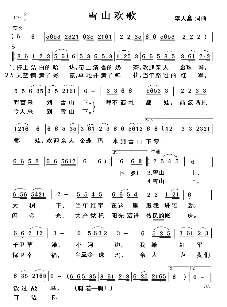 雪山欢歌简谱-李天鑫词/李天鑫曲
