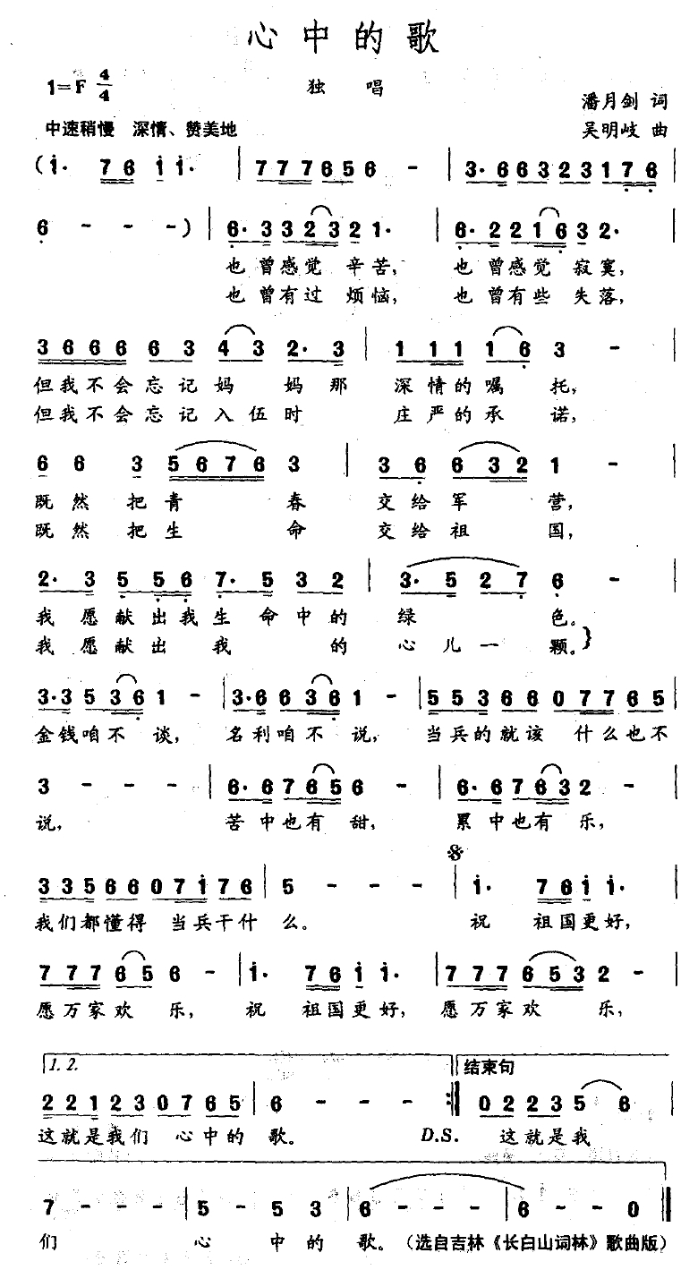 心中的歌简谱-潘月剑词 吴明岐曲简谱
