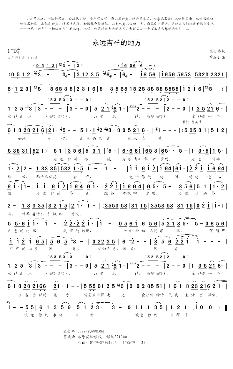 永远吉祥的地方简谱-裘若冬词/贾庭云曲