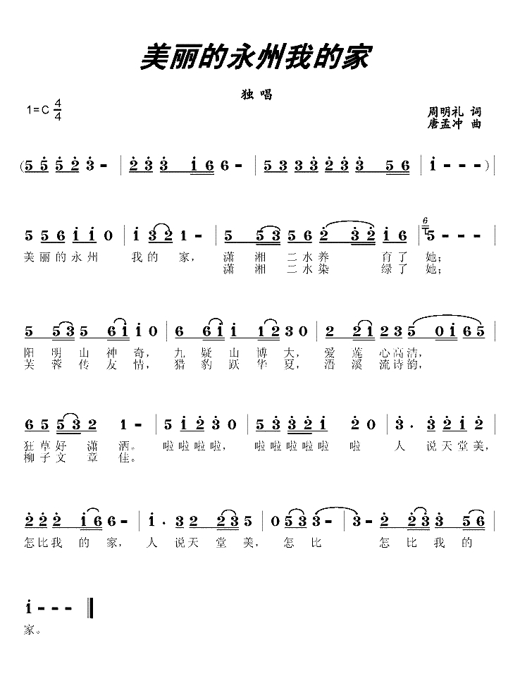美丽的永州我的家简谱-周明礼词/唐孟冲曲