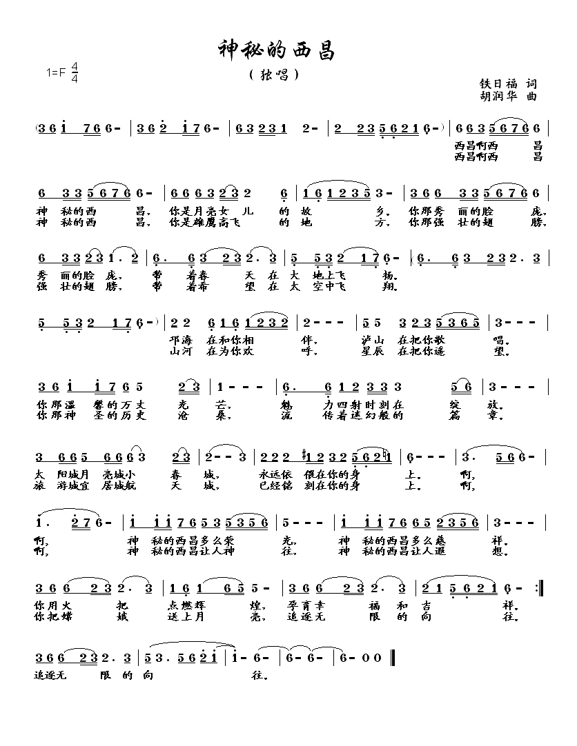 神秘的西昌简谱-铁日福词/胡润华曲