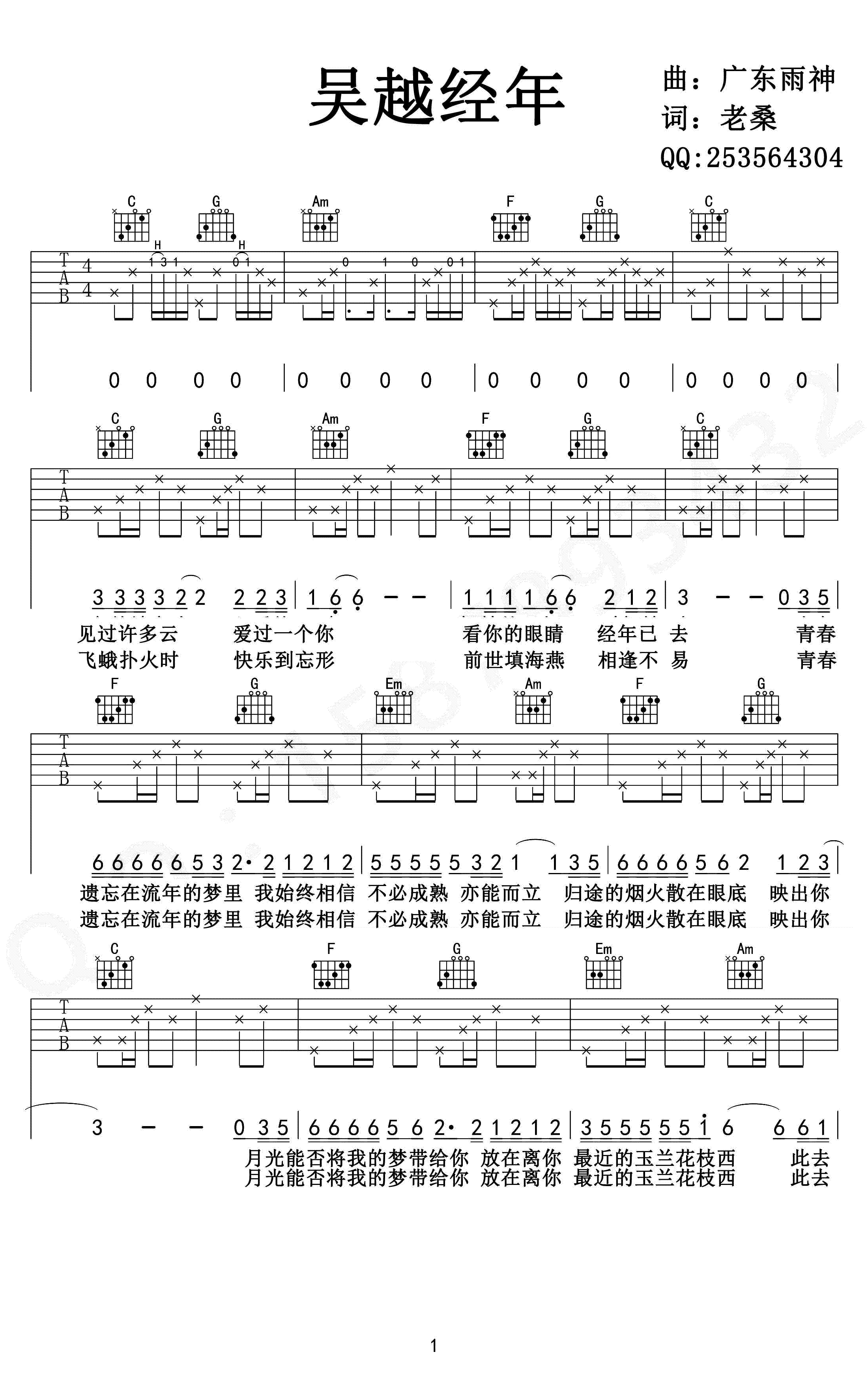 吴越经年吉他谱,广东雨神演唱的热门网络歌曲《广东十年爱情故事》国语改编,老桑作词,吴越经年吉他六线谱,高清弹唱谱,三张高清图片谱。吉他吧网站整理上传。 见过许多云,爱过一个你,青春遗忘在流年的梦里,归途的烟火散在眼底,映出你。