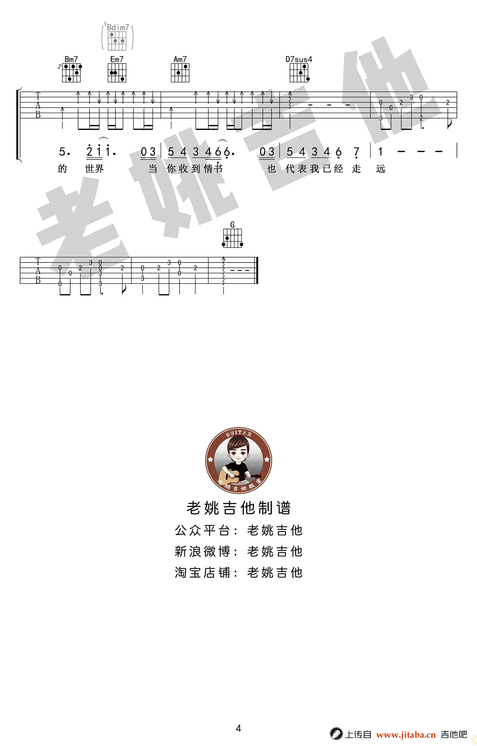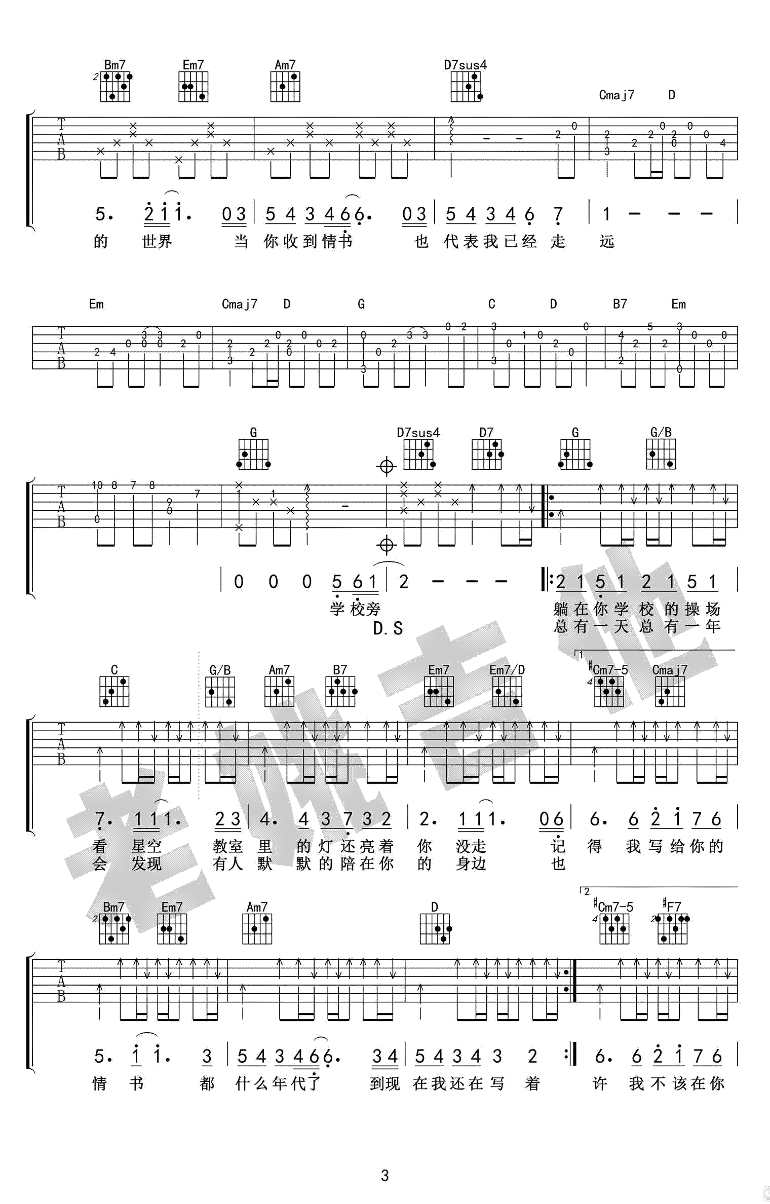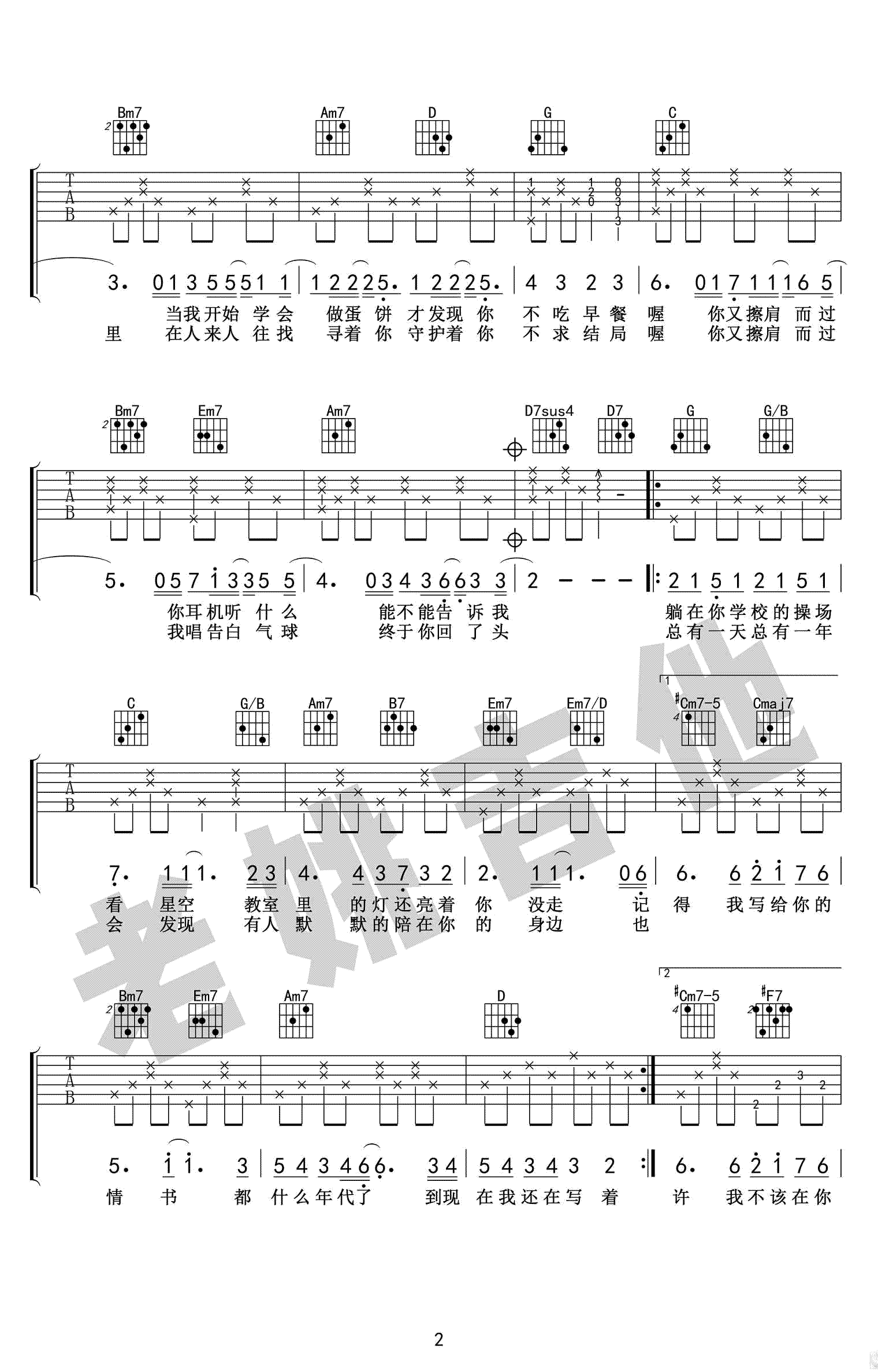 等你下课吉他谱,周杰伦和杨瑞代演唱,原调bA,选用G调指法,变调夹夹第一品。等你下课六线谱,四张高清图片谱,感谢老姚吉他出品,吉他吧网站为琴友们上传推荐。 一首关于暗恋的浪漫情歌,男生喜欢上一个女生,便在她住的巷子里租了一间公寓,只为和她不期而遇。男生每天等着女孩下课,只为了默默守护在她身边。这不就是我们的青春吗?那时我们会假装路过他(她)的班级,只为看一眼喜欢的人。