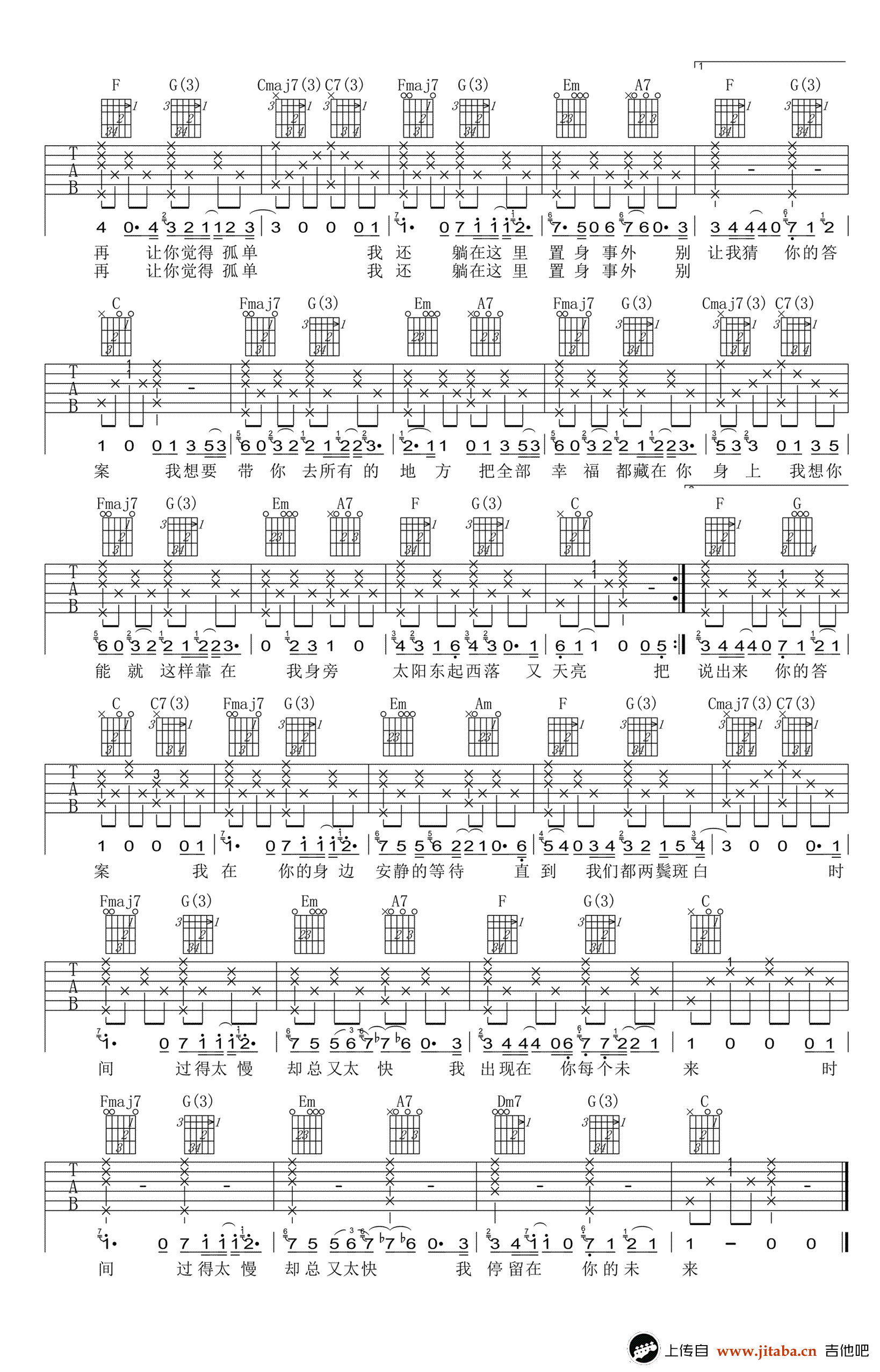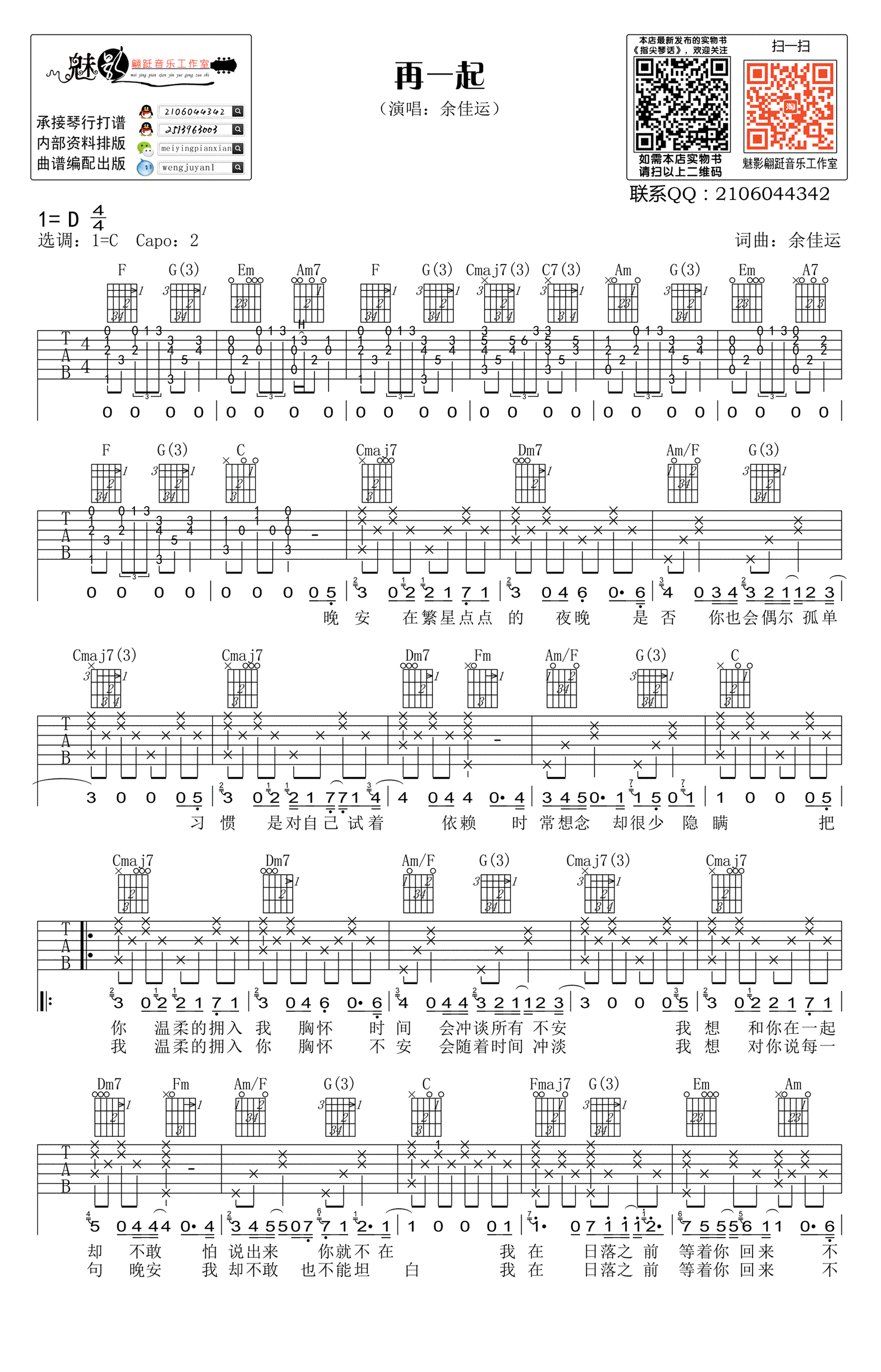 余佳运《再一起》吉他谱,原调D,变调夹夹二品,选用C调指法。再一起吉他弹唱谱,两张图片谱高清版,感谢魅影翩跹音乐工作室出品,吉他吧网站上传分享。 余佳运,一位原创小众歌手,这首歌曲纯粹和简单,没有用花哨的编曲,只是安静地诉说对于音乐对于爱情的那一份温柔。这份真诚的诉说配上这首略带伤感的歌曲,动人的旋律一直萦绕着脑海中。