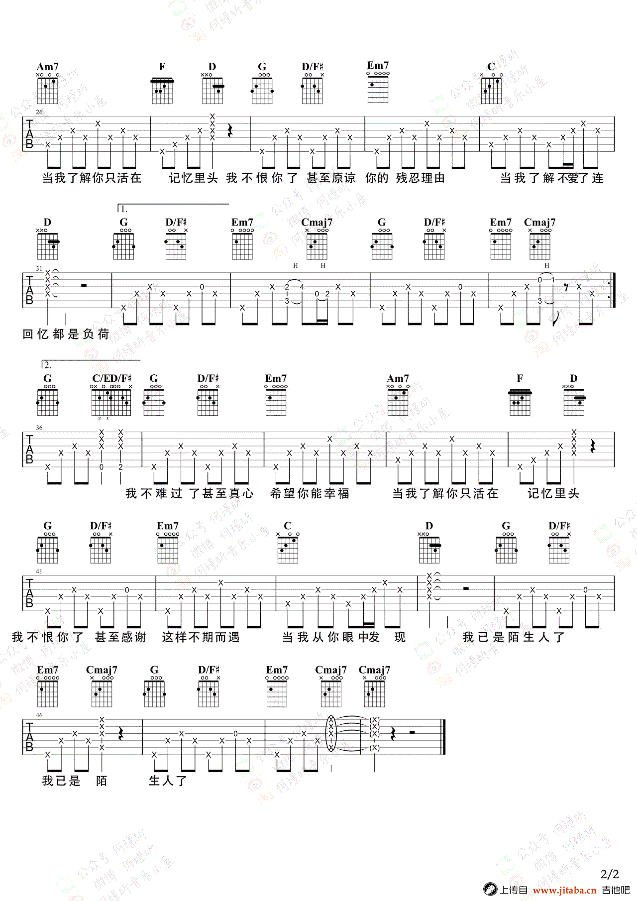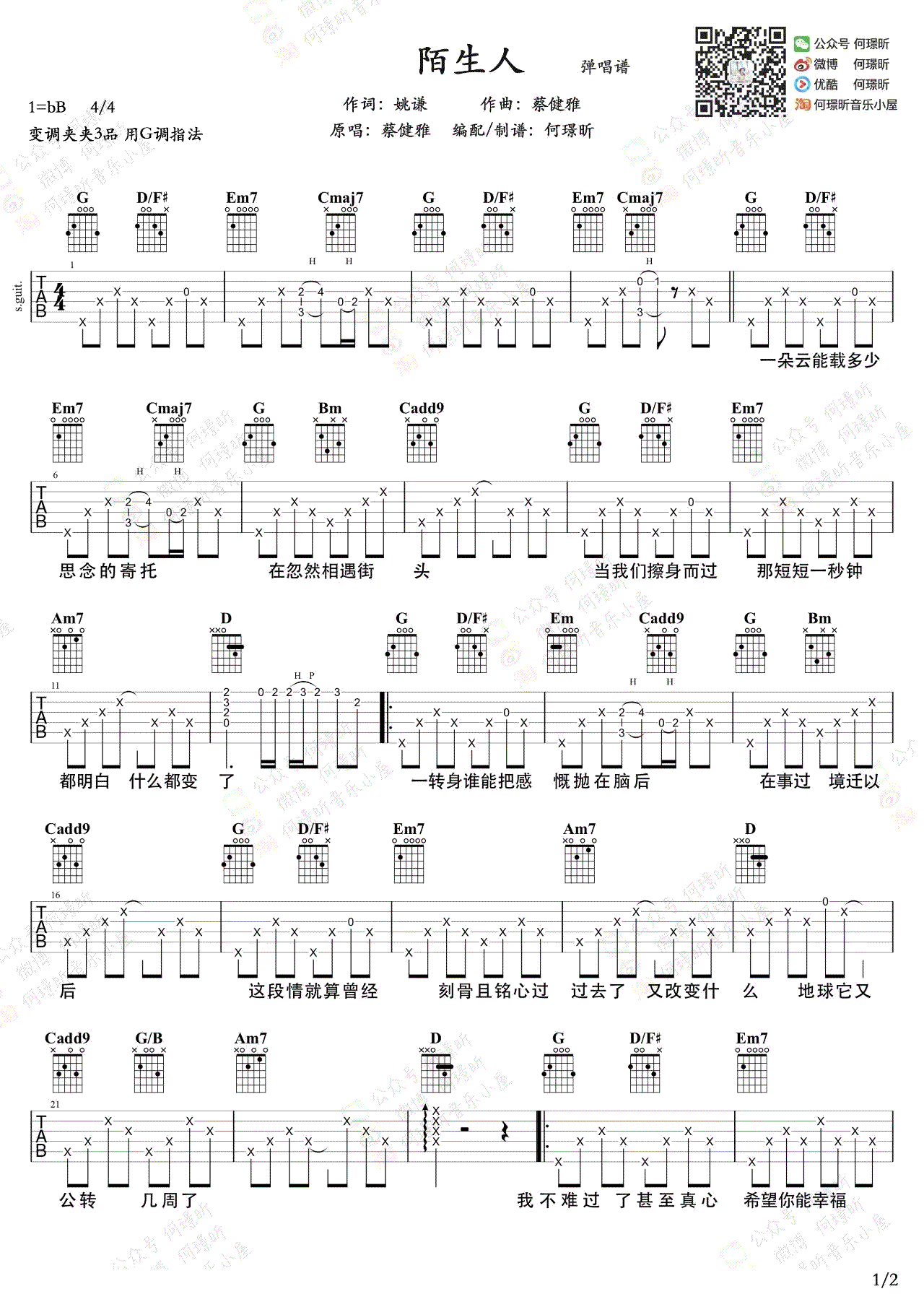 蔡健雅《何璟昕》吉他谱,原调bB,变调夹夹三品,用G调指法,可以结合变调夹找到最适合自己的那个key。蔡健雅的一首经典情歌,陌生人六线谱,三张高清图片谱,感谢何璟昕编配制谱,吉他吧网站上传推荐。随谱附上美女老师带来的《陌生人》吉他弹唱视频,琴友们参照示范演示练习吧。