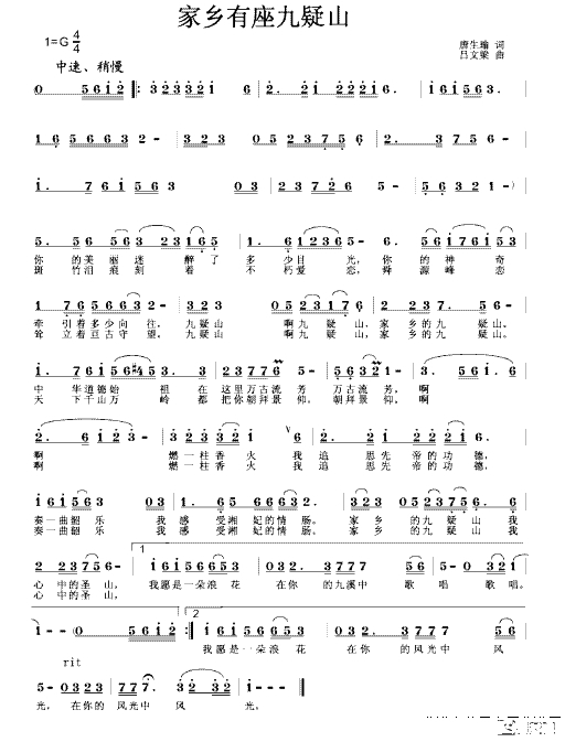 家乡有座九疑山简谱-唐生瑜词/吕文梁曲简谱