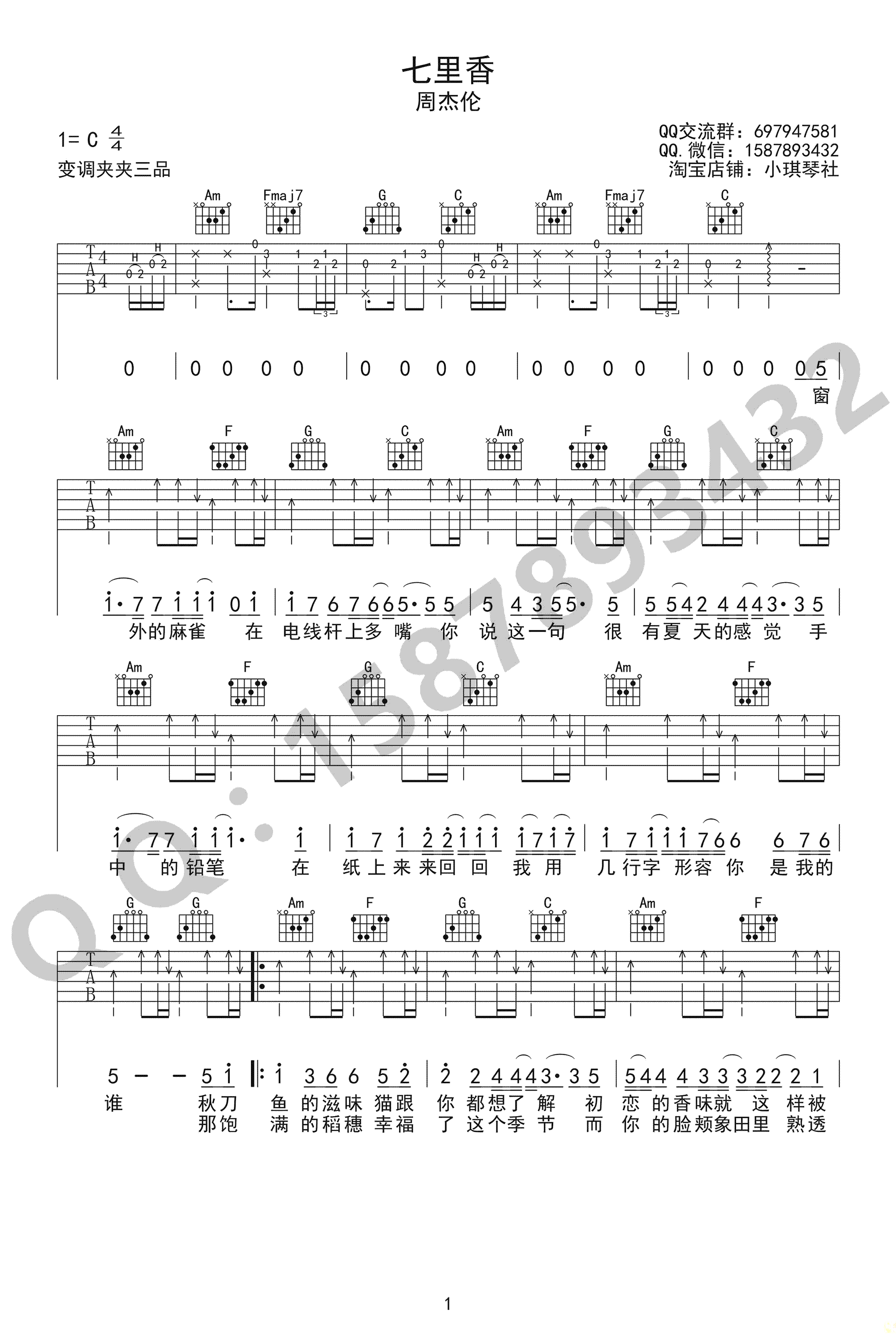 《七里香》吉他谱,C调高清弹唱谱,变调夹夹三品,七里香六线谱,周杰伦的一首经典中国风味的诗意情歌,巍小琪制谱,吉他吧网站上传分享。 怀旧似乎是音乐永恒的主题,周杰伦的《七里香》在那年给了懵懂的我们很多的感动,初恋的滋味,承载着满满的回忆,纪念我们的青春。
