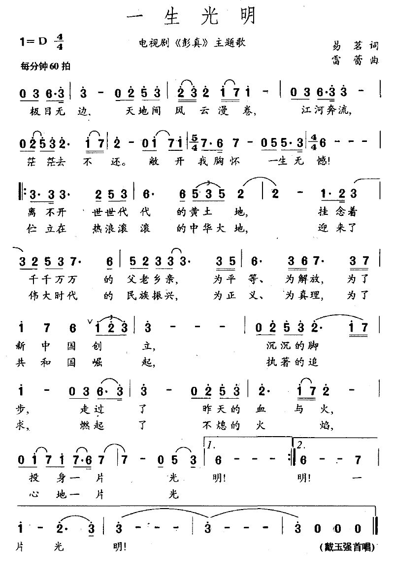 一生光明简谱-电视剧《彭真》主题歌简谱