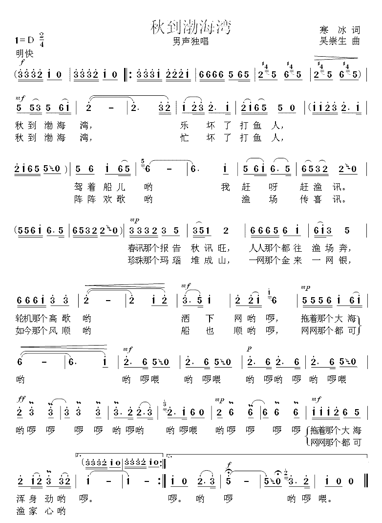 秋到渤海湾简谱-韩冰词/吴崇生曲