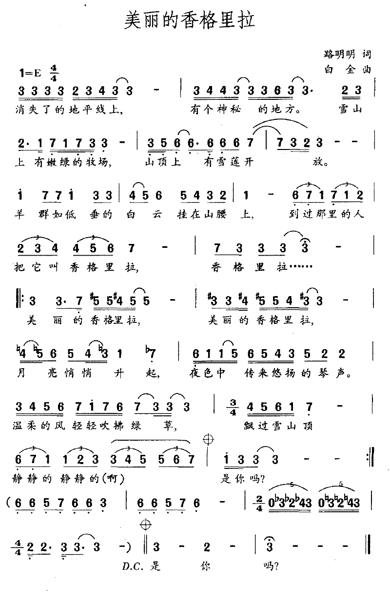 美丽的香格里拉简谱-路明明词 白金曲