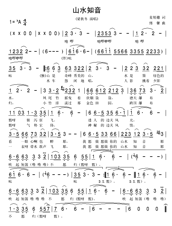 山水知音简谱-梁秋冬演唱