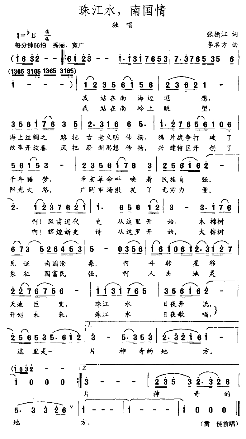 珠江水,南国情简谱-张德江词 李名方曲简谱