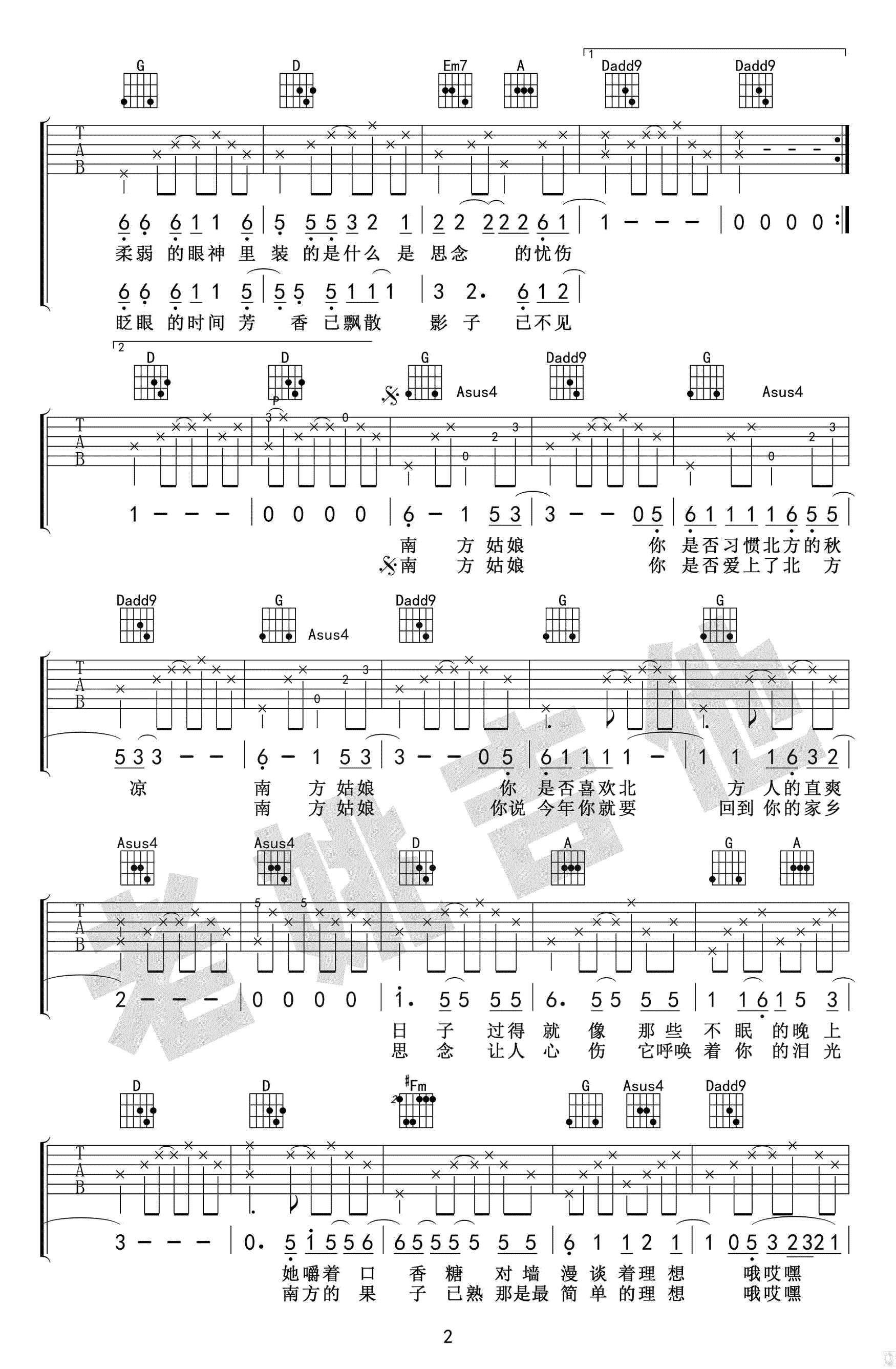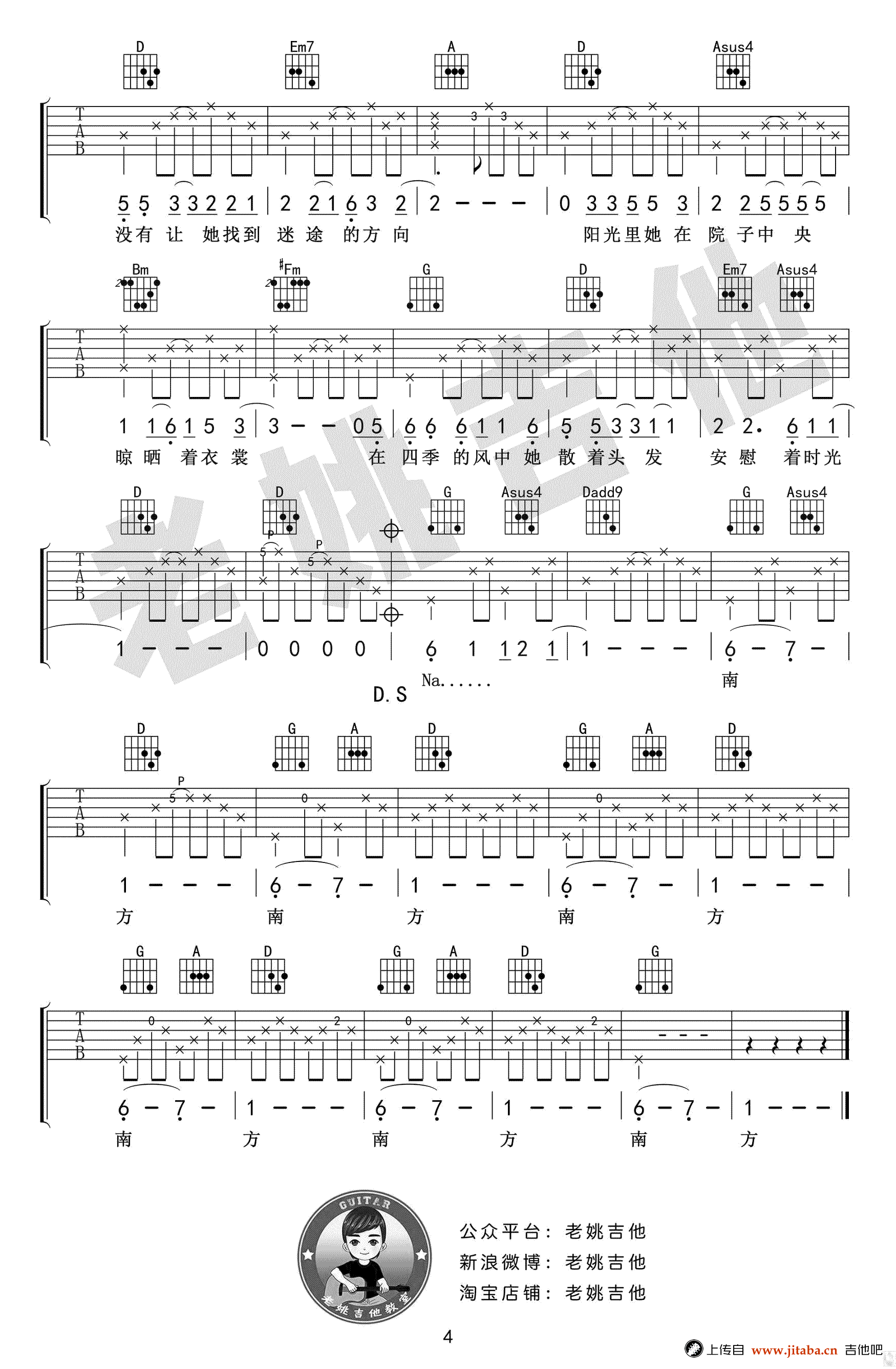 南方姑娘吉他谱,弹唱版,高清图片谱共四张谱例,赵雷的经典代表歌曲,南方姑娘六线谱,原调E,选调D,CAPO夹二品。感谢老姚吉他编配出品,吉他吧网站推荐分享。随谱附上《南方姑娘》吉他弹唱教学视频。