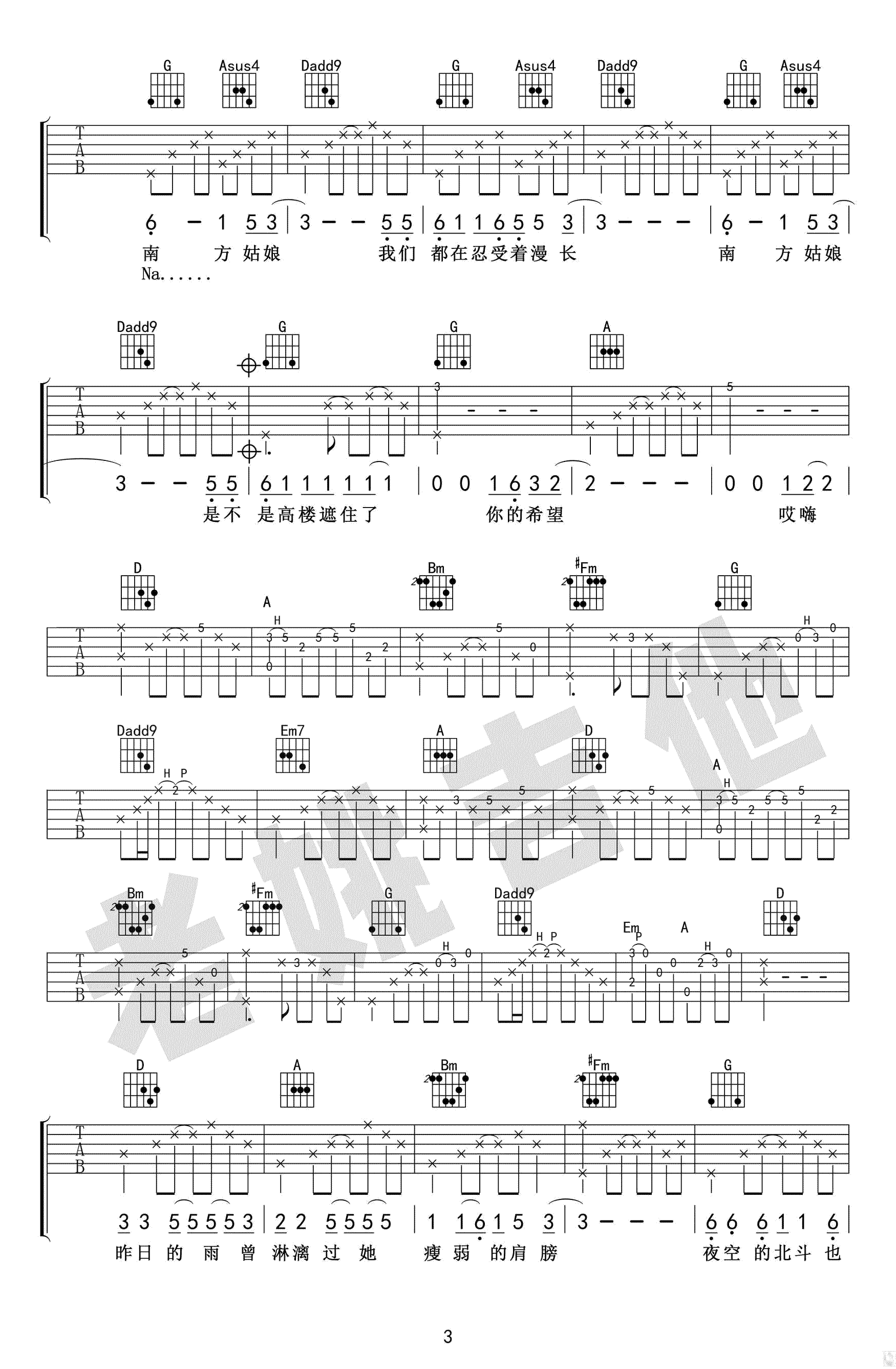 赵雷《南方姑娘》吉他谱_弹唱版_D调指法_高清图片谱