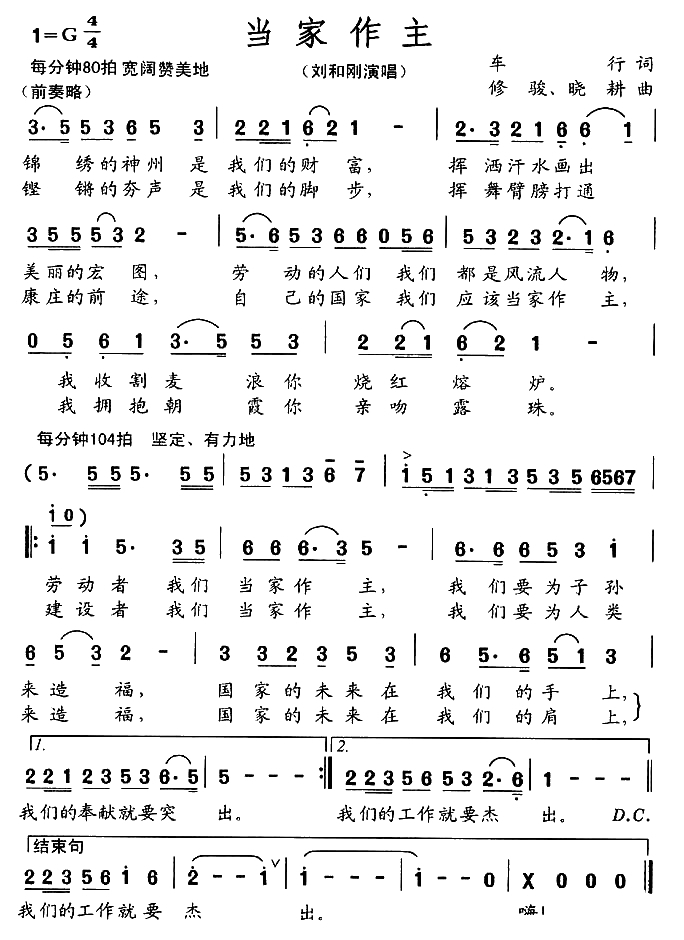 当家作主简谱-刘和刚演唱
