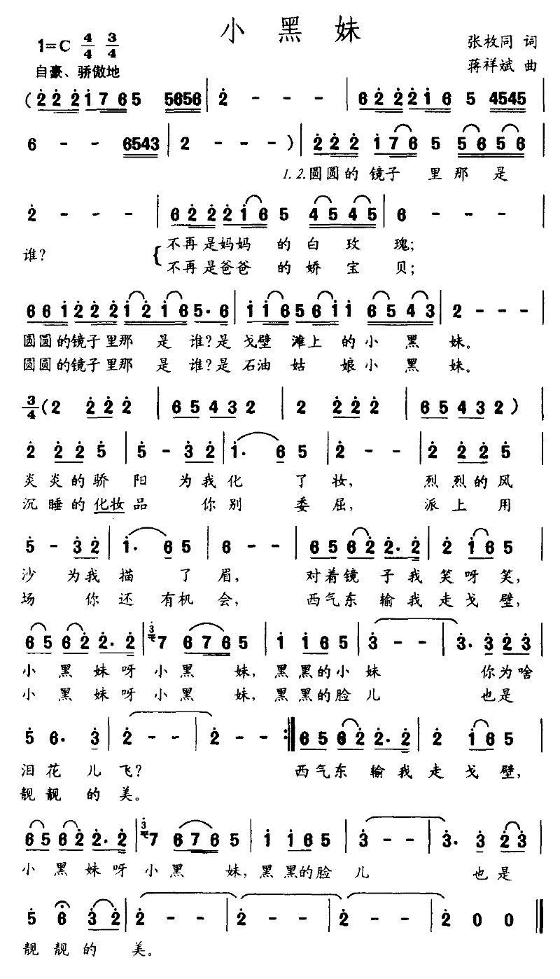 小黑妹简谱-张枚同词 蒋祥斌曲