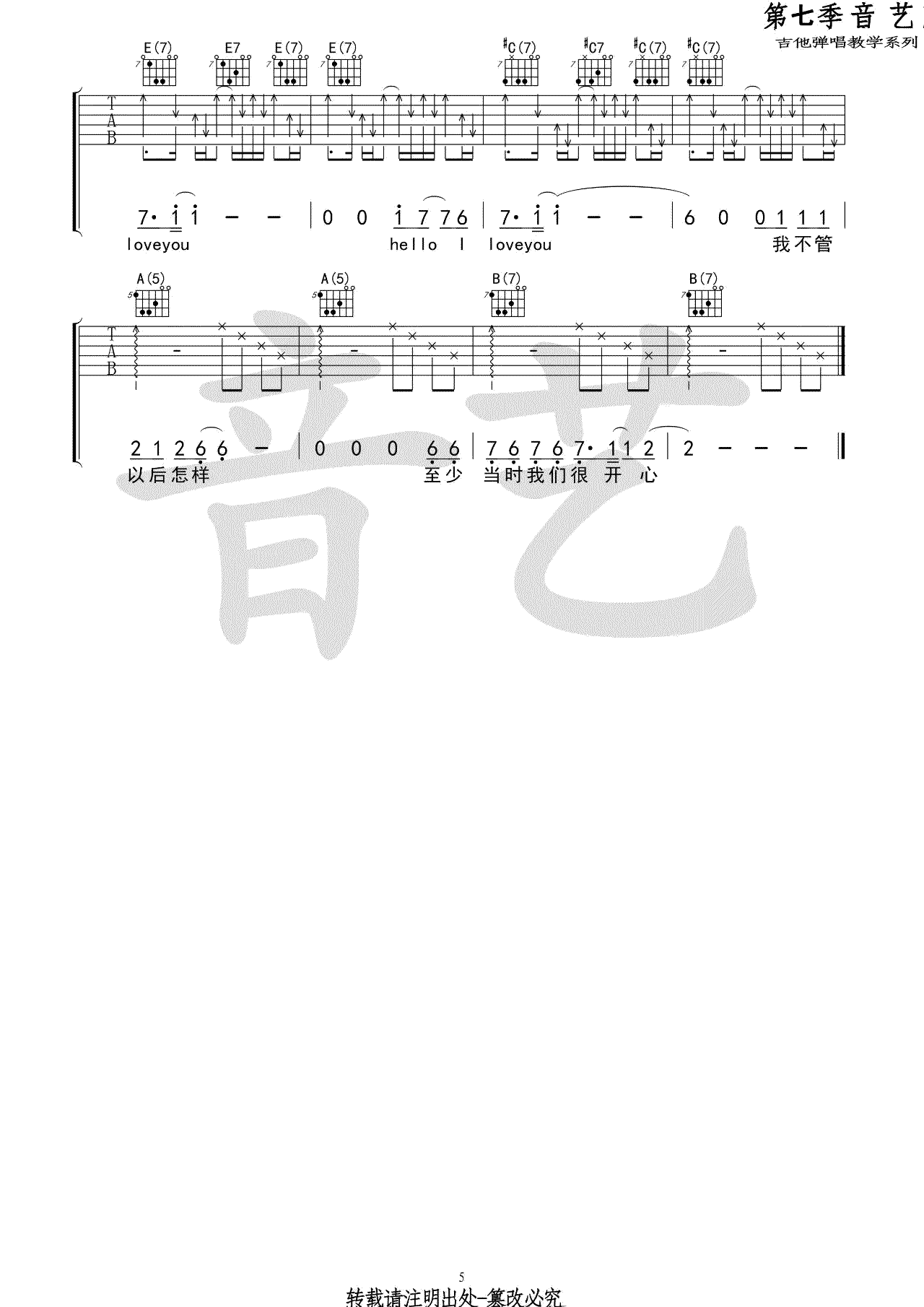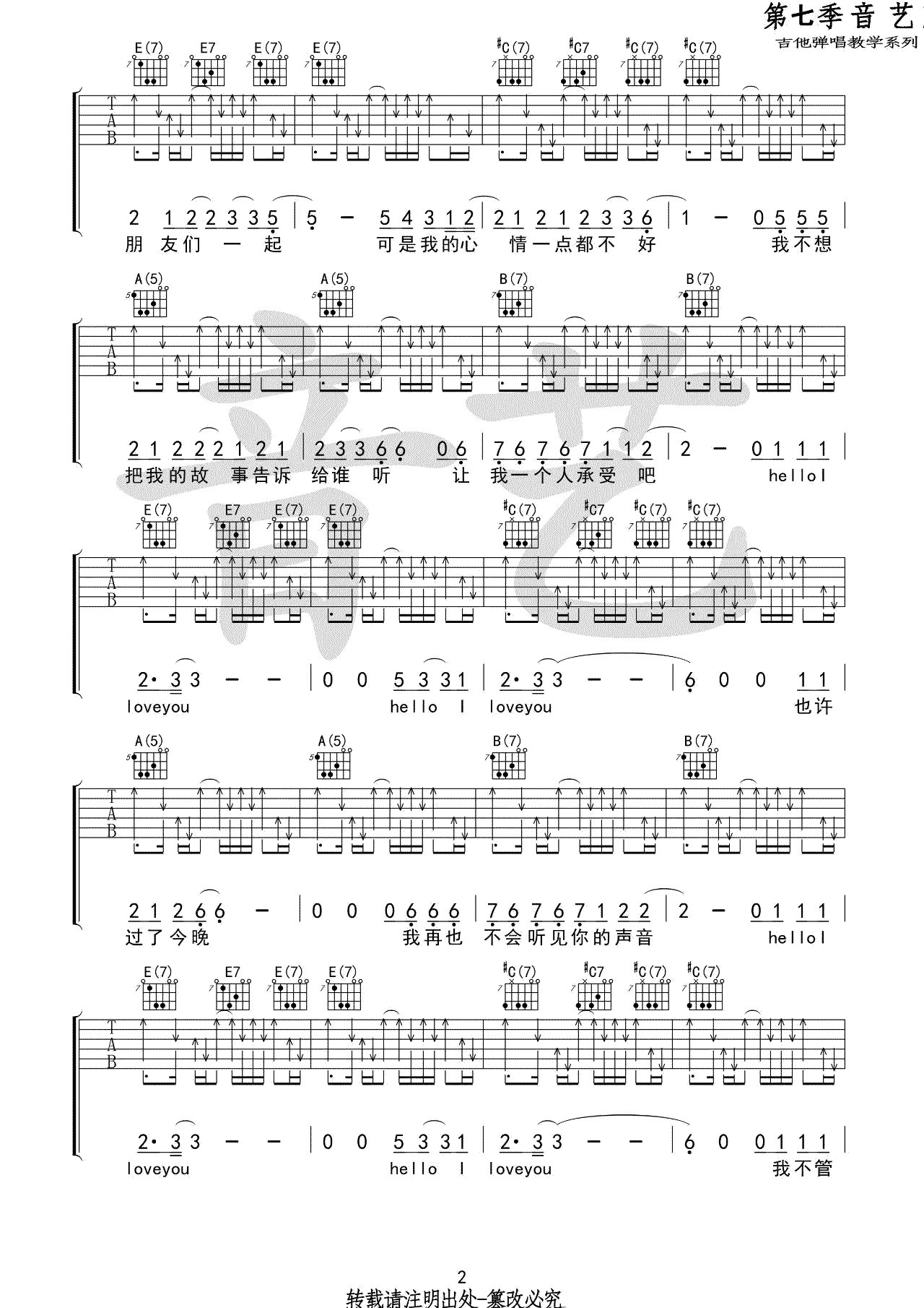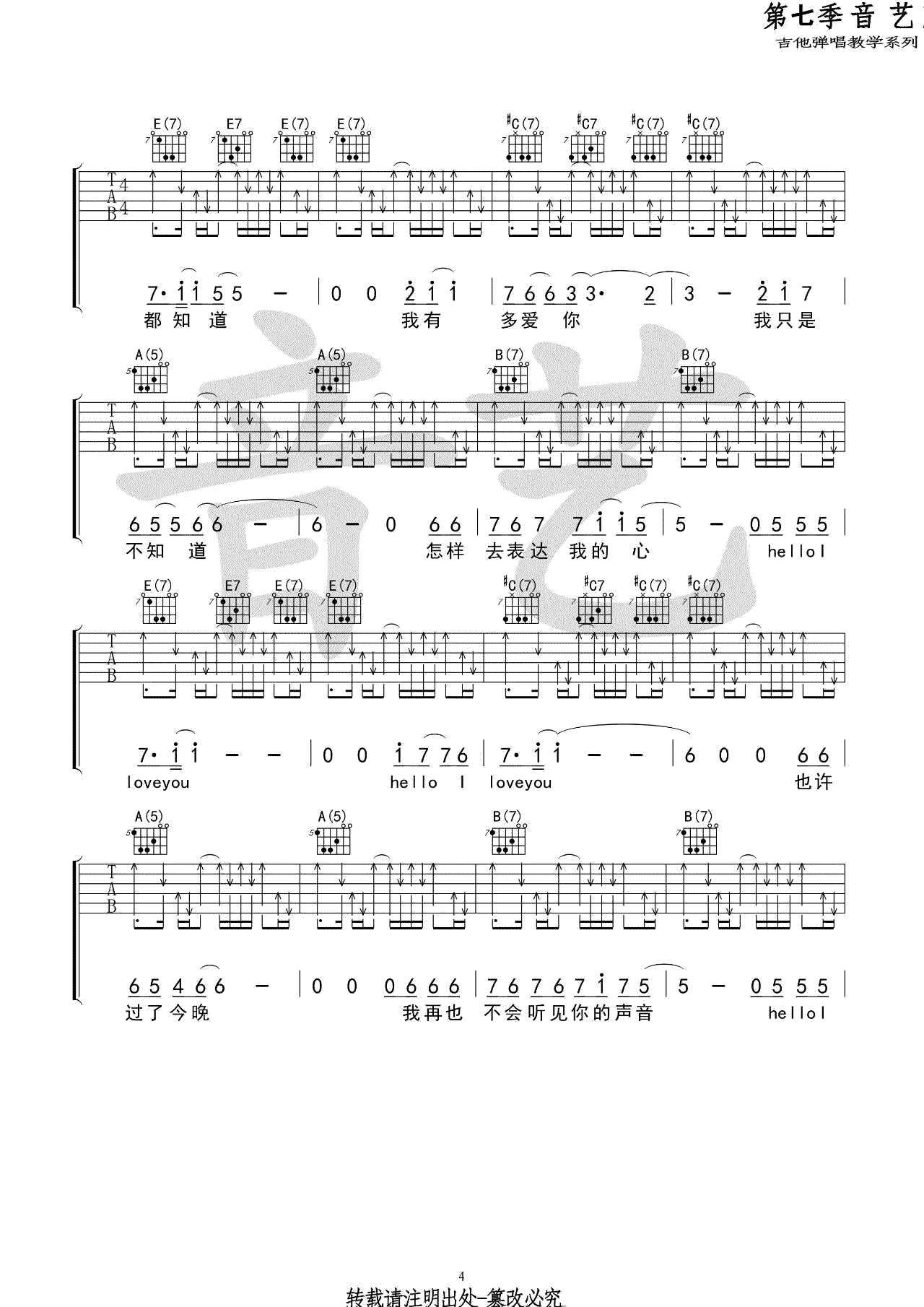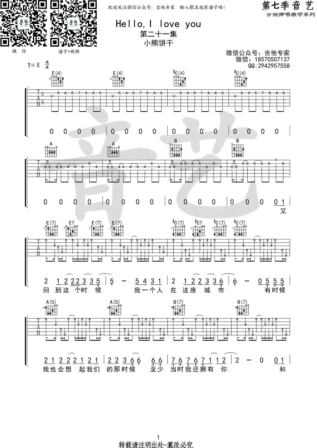 Hello,I love you吉他谱,小熊饼干乐队演唱,E调指法,Hello,I love you吉他六线谱,完整版高清图片谱,感谢音艺吉他出品,吉他吧网站上传分享。 摇滚猫老师编配的这首歌曲是为琴友(磁语世界)量身定制的,歌曲和声其实很简单——1 6 4 5,不过在编曲的时候和弦外音的实用很有特点,老司机可以好好琢磨下,节奏律动不太好掌握哦!挑战吧!