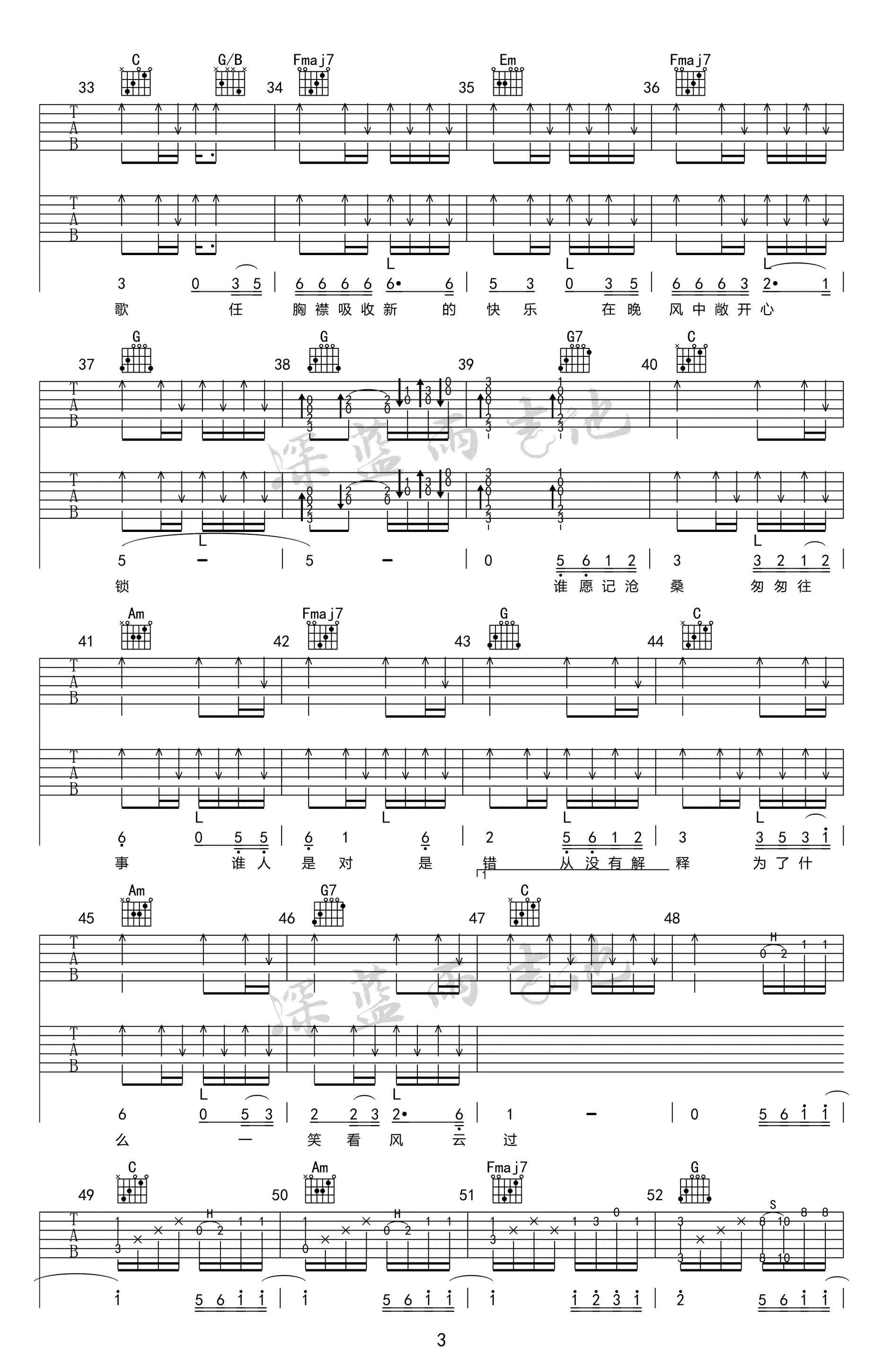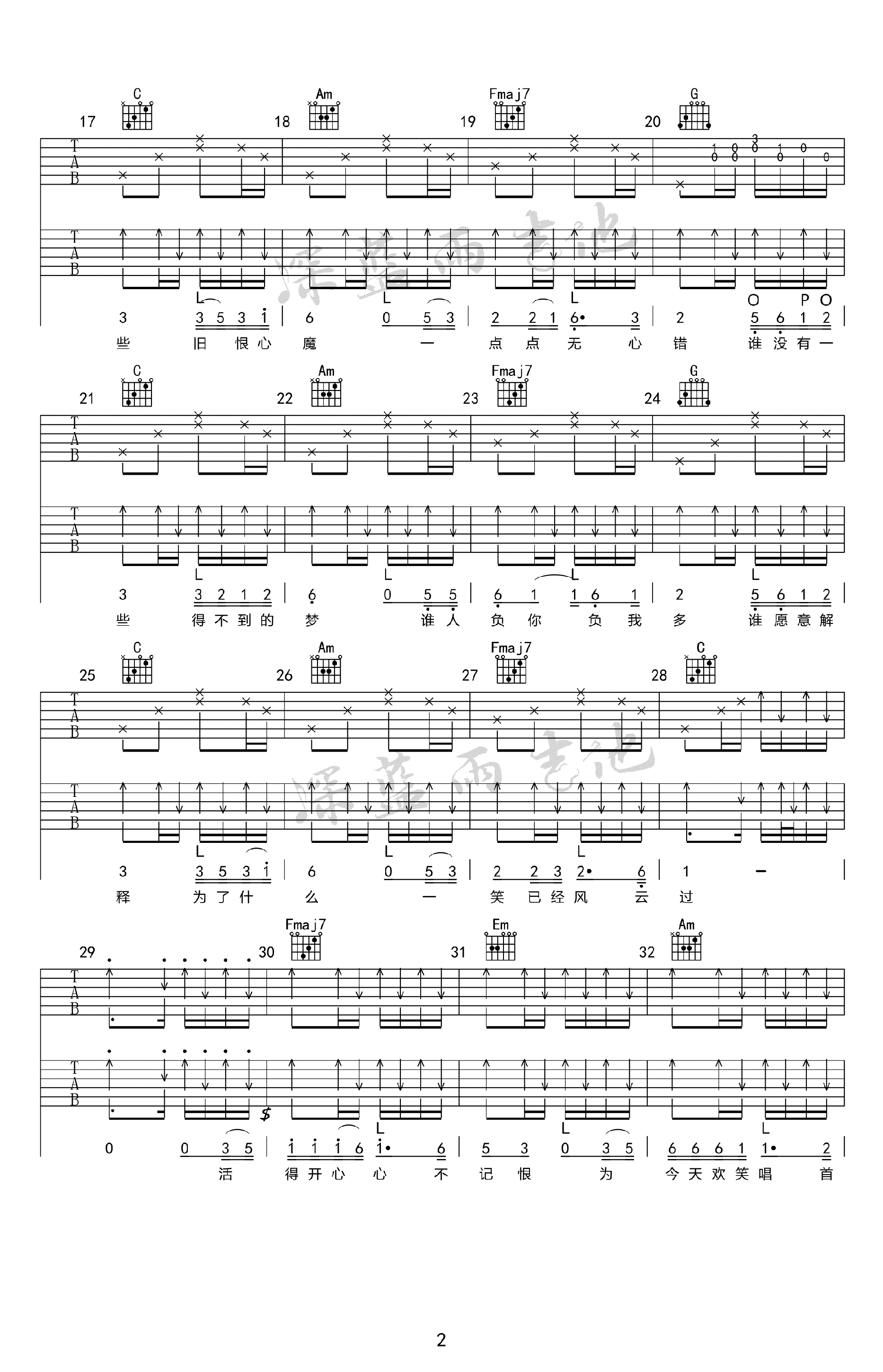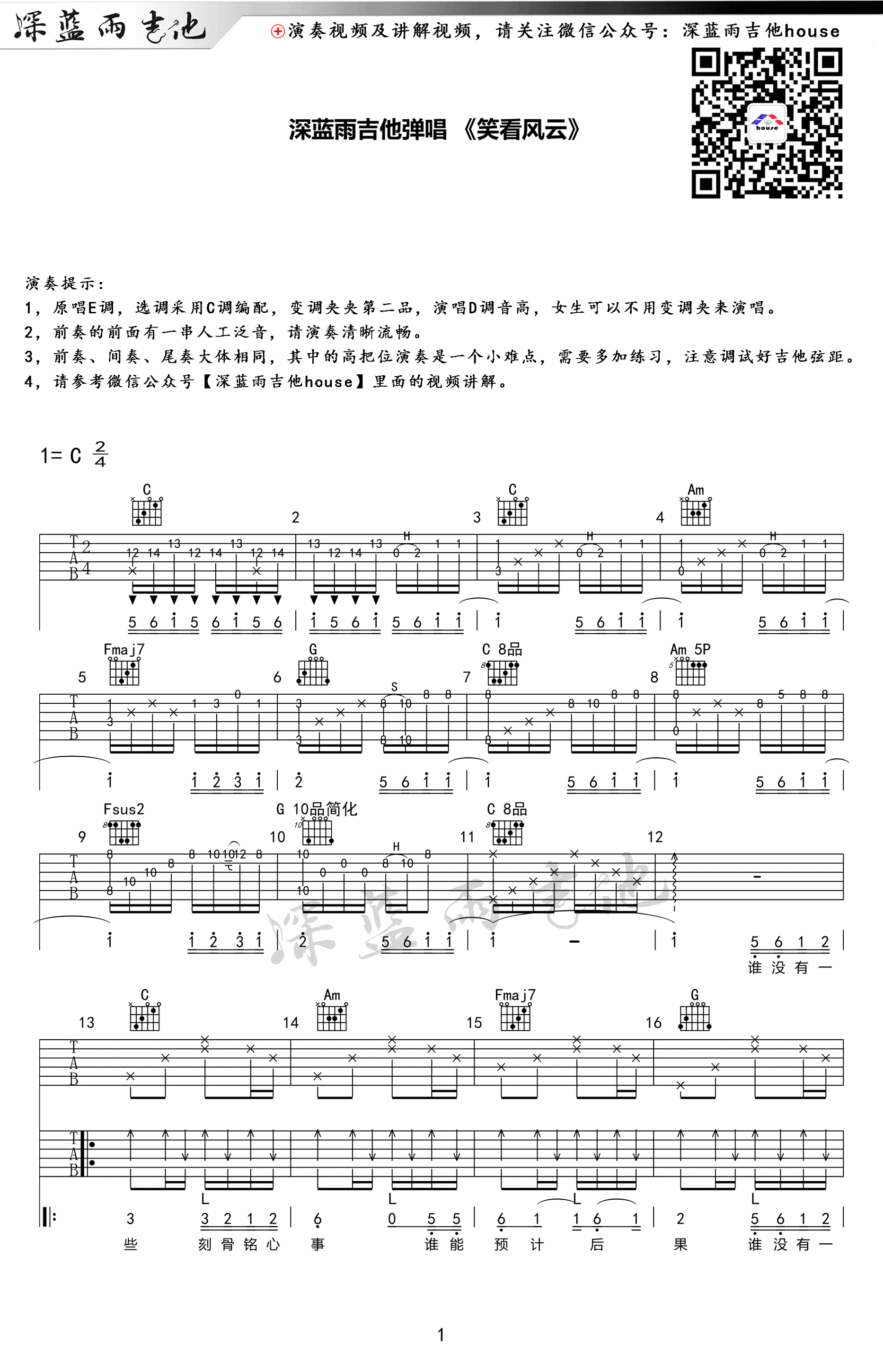 笑看风云吉他谱,郑少秋的一首经典粤语歌曲,笑看风云吉他六线谱,高清弹唱图片谱,完整版四张谱例。感谢深蓝雨吉他编配出品。演奏提示:原唱E调选调,采用C调编配,变调夹夹第二品,演唱D调音高;女生可以不用变调夹来演唱。前奏的前面有一串人工泛音,请演奏清晰流畅。前奏间奏尾奏大体相同,其中的高把位演奏是一个小难点,需要多加练习,注意调适好吉他弦距。一个个潇洒的转身、清雅的微笑,是郑少秋留给无数观众最经典的回忆。 随谱附上《笑看风云》吉他弹唱视频: 郑少秋《笑看风云》吉他教学视频: