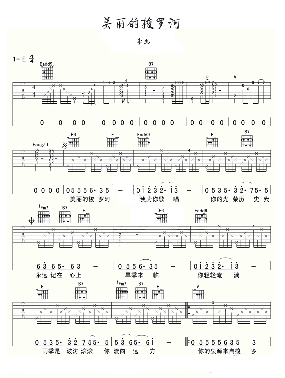 美丽的梭罗河吉他谱,李志演唱,E调指法编配,美丽的梭罗河六线谱,改编自印尼民歌,姜文所导演的影片《太阳照常升起》插曲,吉他吧网站整理上传。 少女银铃般的笑声,还有那如丝绸凝脂般滑腻的女声,那个疯狂的年代、消逝的理想,还有萦绕在心头的天鹅绒质感。这些美好与幻想都在《太阳照常升起》,黄秋生唱起《美丽的梭罗河》竟然格外迷人。