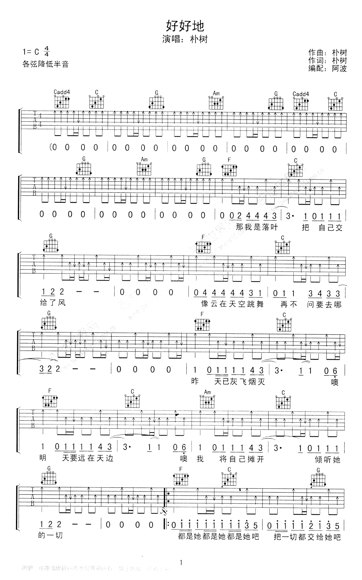 好好地吉他谱,朴树演唱,C调指法,各弦降低半音,好好地六线谱,三张图片谱。感谢阿波编配,吉他吧网站整理上传。 歌词依旧文艺朴素,旋律依旧轻快舒畅,就像永远不老的追风少年,在音乐的世界里,即便久别重逢,朴树依旧显得这般年轻极具生命力。