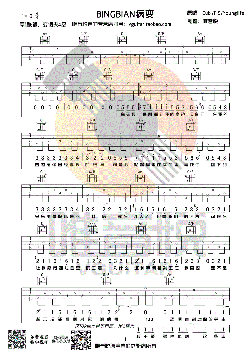 病变吉他谱,原调E调,变调夹夹四品,选用C调指法编配,病变吉他六线谱,四张图片谱,唯音悦编配制谱,吉他吧网站推荐上传。 一首洗脑的网络歌曲,伤感的歌词,动听的旋律,勾起了多少人对喜欢人的回忆。鞠文娴翻唱的《病变》非常的火,相比较男生版,女生版更加细腻好听。