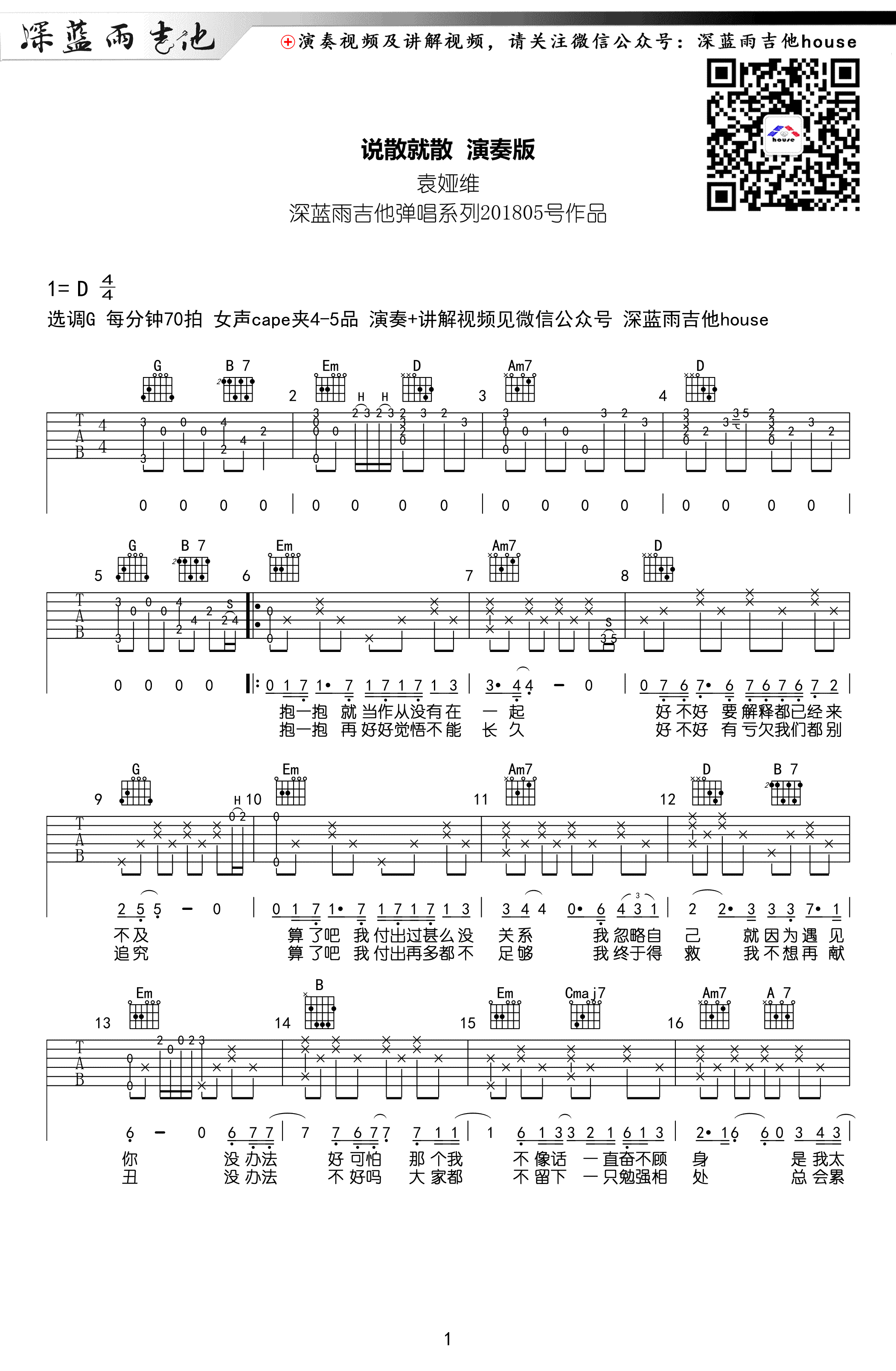 袁娅维《说散就散》吉他谱,G调指法编配,女生变调夹4-5品,三张高清弹唱图片谱。说散就散六线谱,深蓝雨吉他编配出品,吉他吧网站推荐上传。 热映电影《前任三》主题曲,JC陈咏桐原唱,一首让人单曲循环的歌曲,哭红了多少人的眼框,唱出了自我的救赎,让人回忆起最疼最扎心的情感,“因为成长,我们忽尔间说散就散”懂词的无奈, 懂歌心酸 ,可是谁懂深夜想念她/他时的无奈和悲哀。