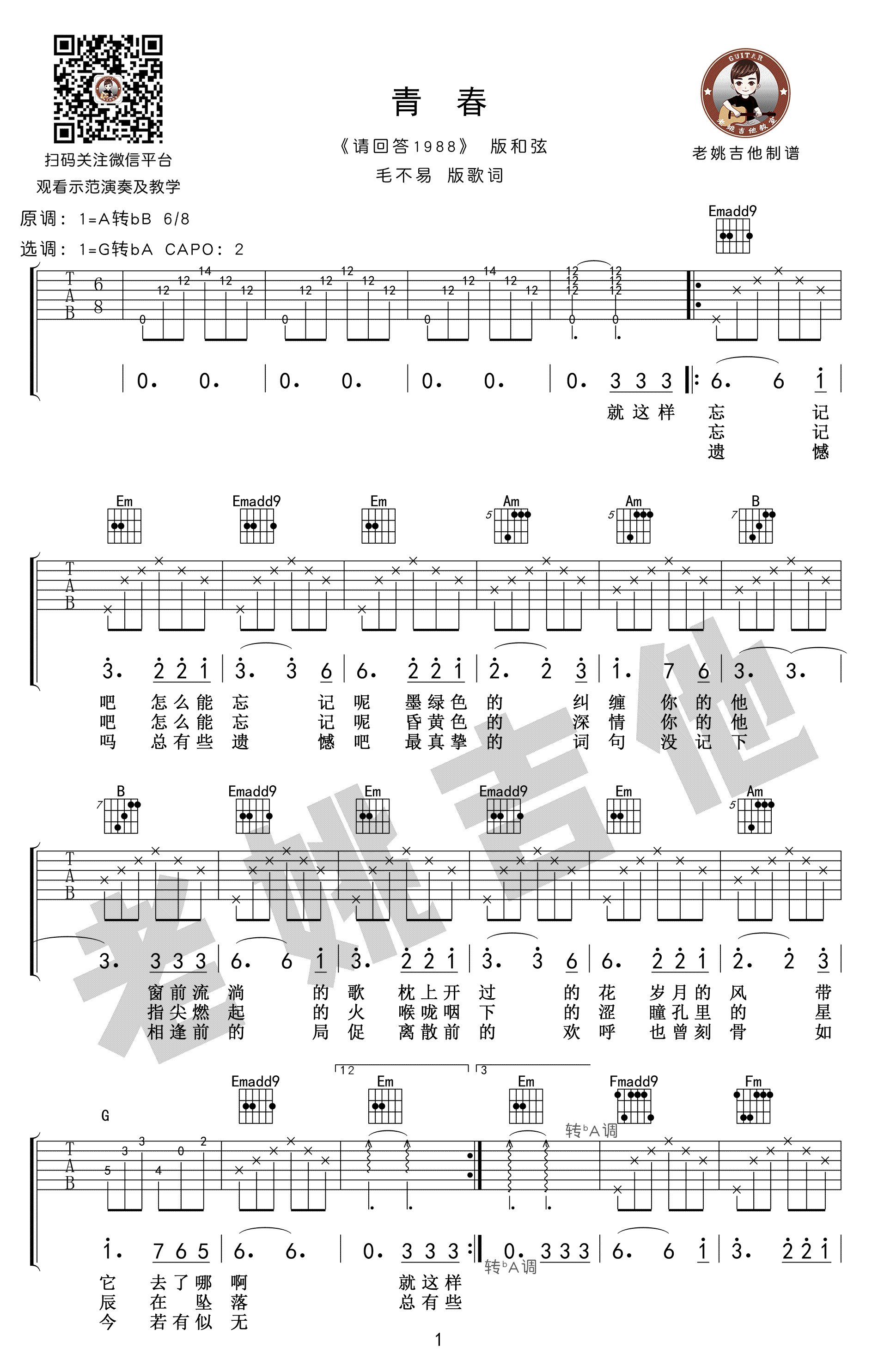 毛不易《青春》吉他谱,韩剧《请回答1988》主题曲中文版,青春六线谱,G调转降A调,CAPO夹二品,三张高清弹唱图片谱。感谢老姚吉他编配出品,并带来吉他弹唱教学视频,吉他吧推荐上传。 《请回答1988》里平凡却真实有爱的故事, 让多少人哭着不舍这部剧的完结, 又有多少人将主题曲《青春》设为单曲循环, 毛不易将这首经典之作重新填词翻唱, 改编成中文版,开口瞬间唤起观众的记忆。