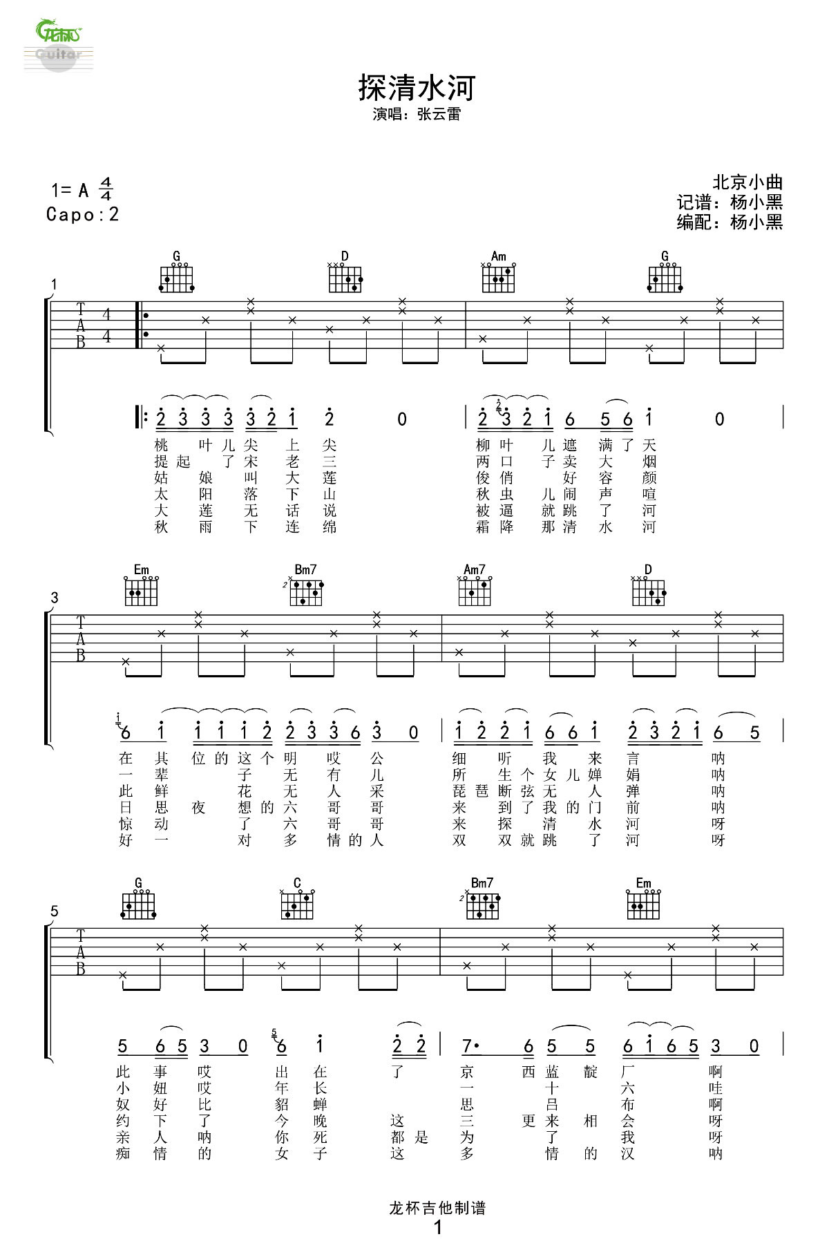 张云雷《探清水河》吉他谱,A调弹唱谱,Capo夹二品,探清水河六线谱。高清图片谱,感谢龙杯吉他出品,杨小黑老师记谱编配,吉他吧网站推荐上传。 一首好听又好唱的北京小曲,改编自一对痴情人殉情的故事,相声演员张云雷性情演绎,圈粉无数。