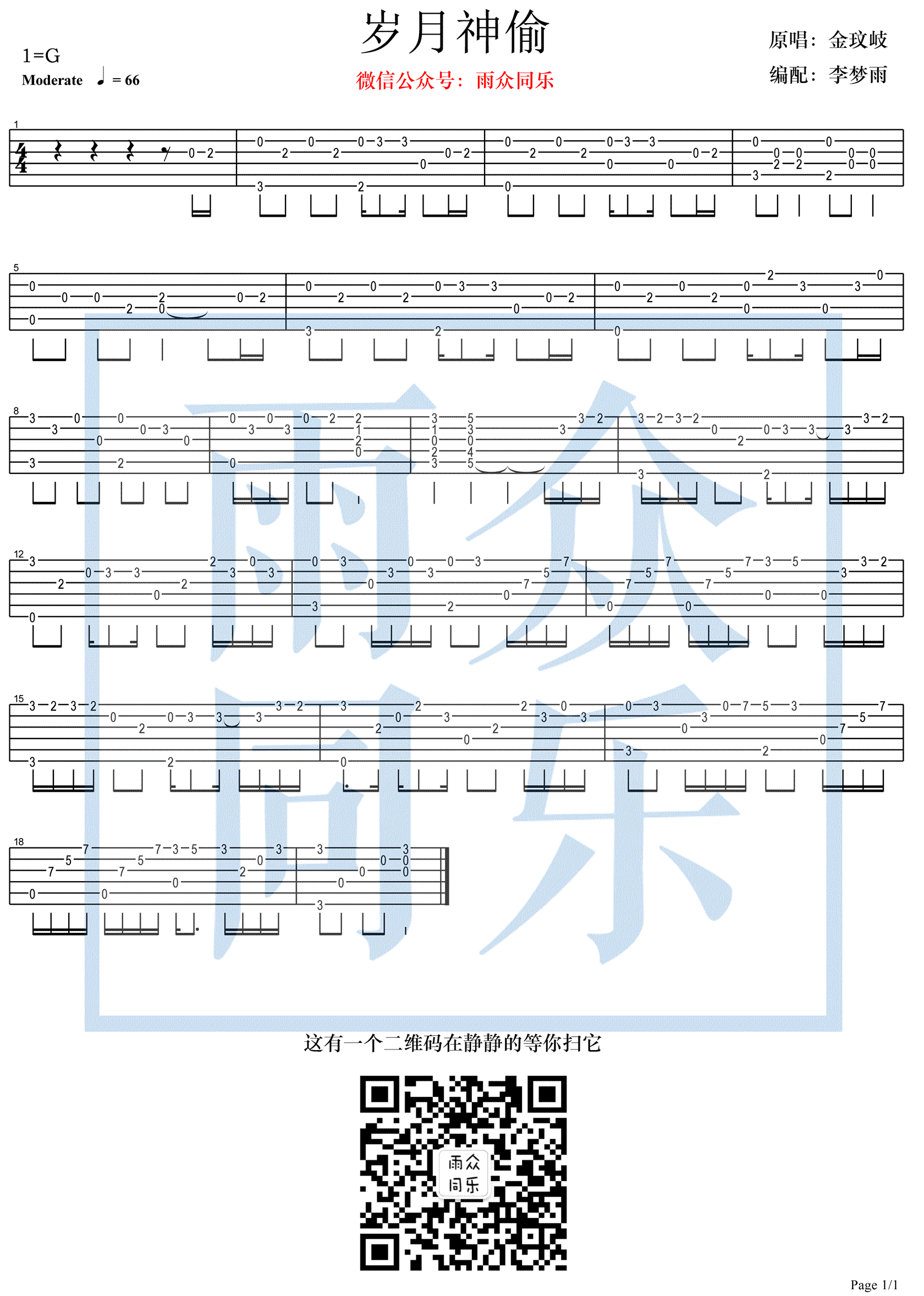 岁月神偷指弹吉他谱,改编自金玟岐演唱的歌曲,岁月神偷吉他独奏谱,高清图片谱,感谢雨众同乐编配出品,吉他吧网站上传。 喜欢一首歌,可能是因为它动听的旋律,亦或是它动人的歌词。无论是因为什么,里面都蕴含着我们对它特有的情感。 金玟岐的《岁月神偷》送给琴友们,一起思考岁月这场有去无回的旅行。