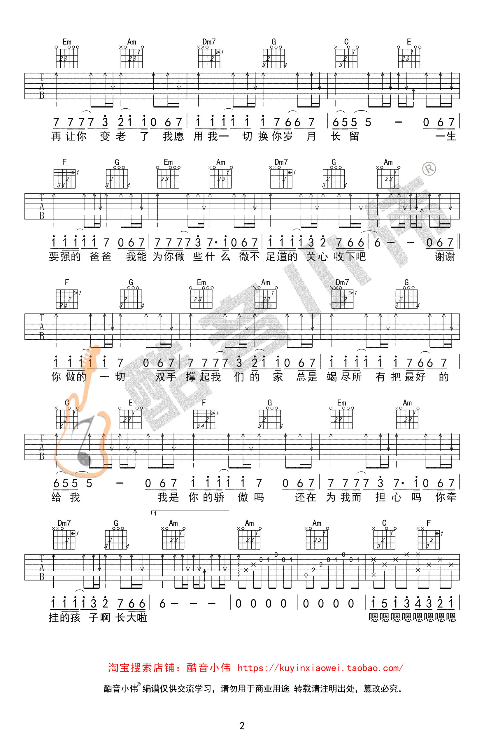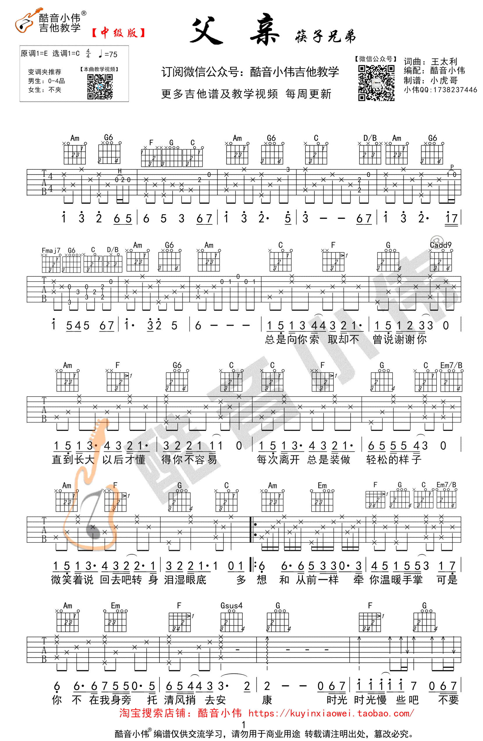 父亲吉他谱,筷子兄弟的一首经典吉他弹唱歌曲,本曲谱为中级版编配,原调E,选调C,变调夹男生0-4品,父亲六线谱,高清图片谱三张谱例,感谢酷音小伟编配出品,吉他吧网站附上《父亲》吉他弹唱教学视频,琴友们参照配套曲谱跟随老师调讲解示范进行练习。