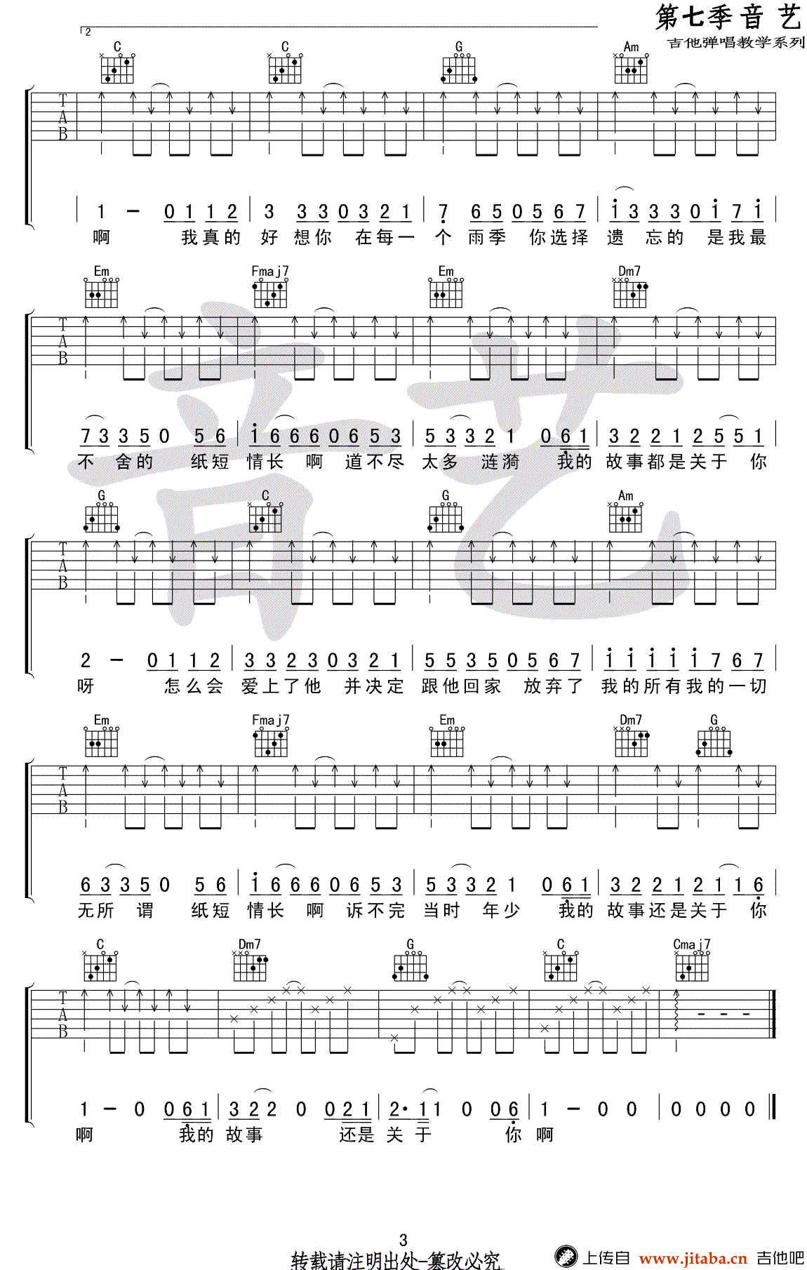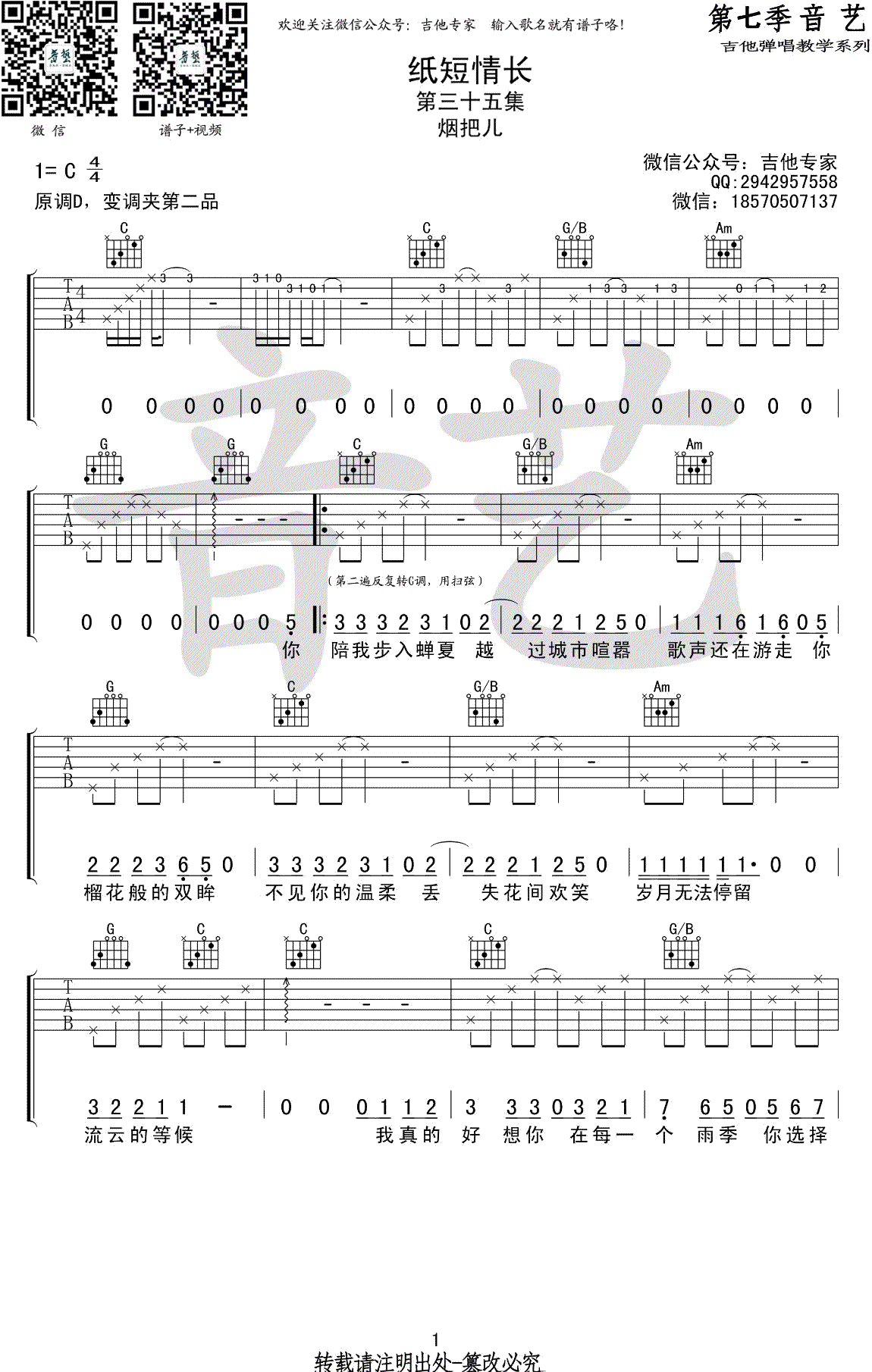 烟把儿乐队《纸短情长》吉他谱,C调弹唱谱,变调夹第二品,一首纯净深情的民谣歌曲,纸短情长六线谱,三张高清弹唱图片谱。感谢艺音出品,吉他吧网站整理上传。 摇滚猫老师编配说明,完整版用的D调,不过中间女生转了G调,如果是男生唱的话直接用变调夹2品,女生的话这首歌曲夹5到7品吧。为了一把吉他比较好弹,有改遍了一些!每个人都有一段蚀骨的回忆,只是多年后,唯剩回不去的旧时光,将这段回忆寄托于歌,抒发对爱情的存忆。