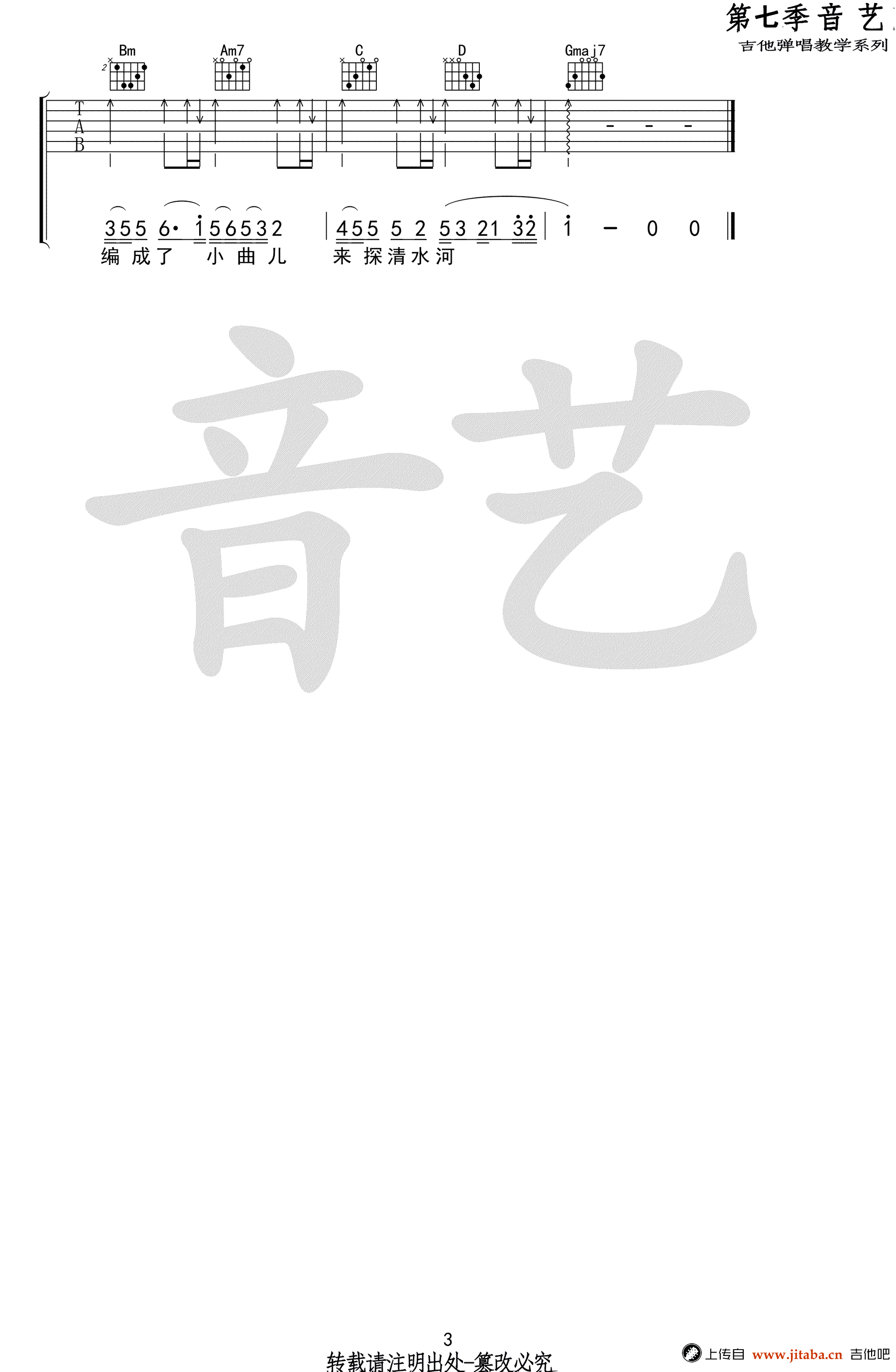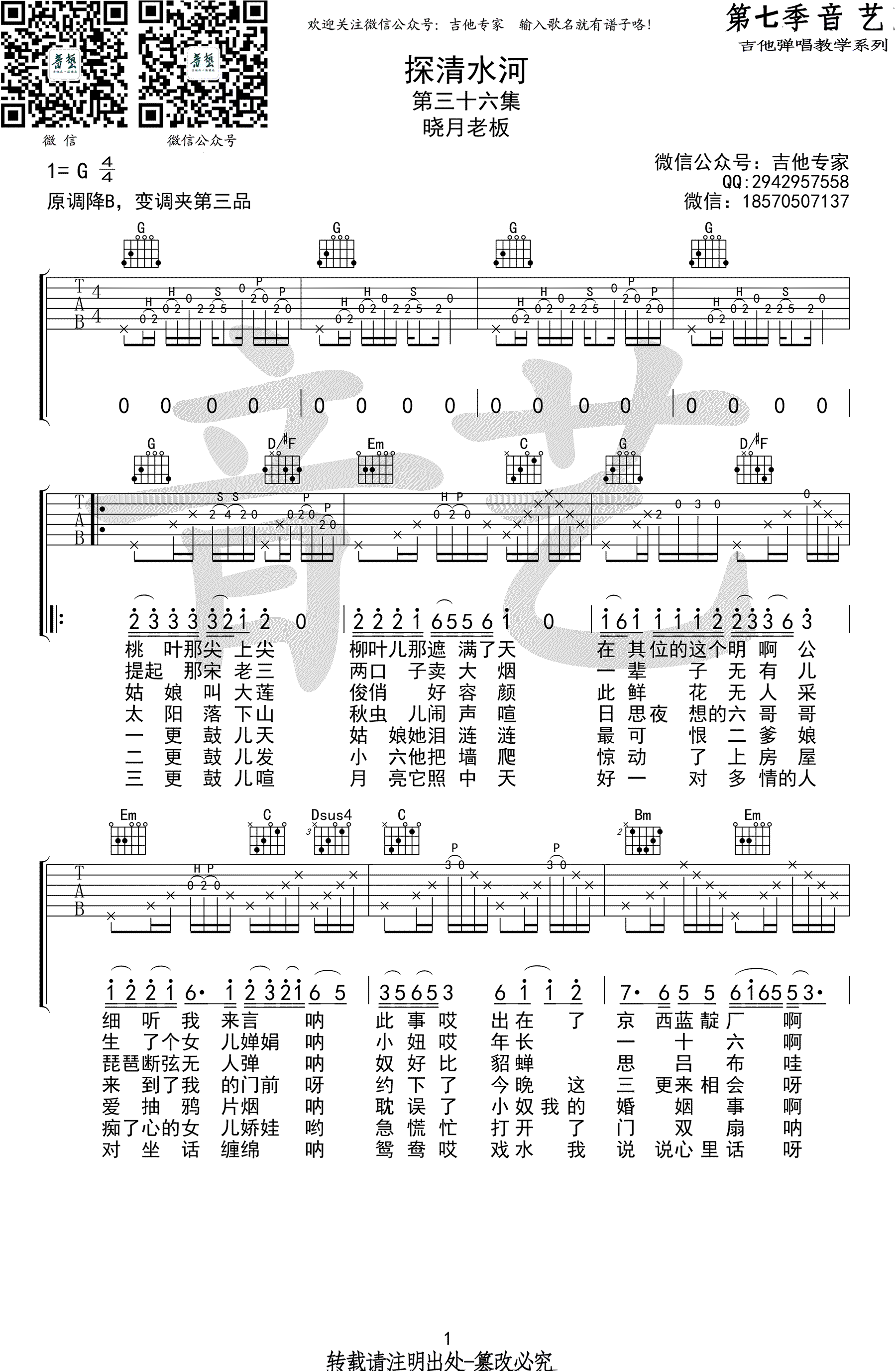 探清水河吉他谱,张云雷演唱,晓月老板版本,原调降B,变调夹夹第三品,选用G调指法,探清水河六线谱,三张高清弹唱谱,感谢艺音出品,吉他吧网站上传分享。 摇滚猫老师编配说明,探清水河有很多翻唱的版本,不过发现晓月老板版本是最舒服的,也是编配得最好的!后半部分转到了C调,大家可以直接把变调夹往下移两品!细心的琴友会发现两段的和弦编配是不一样的哦!