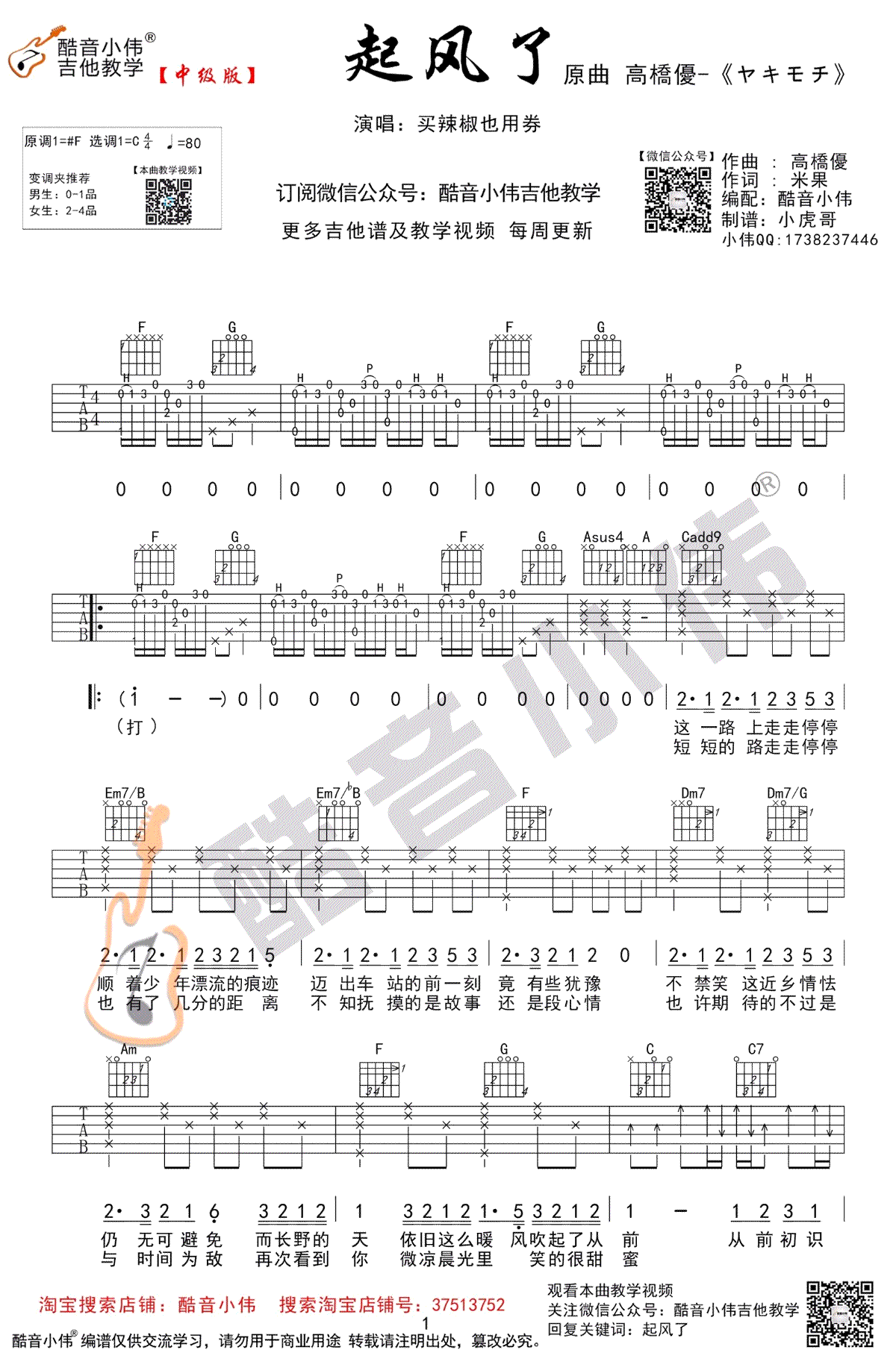 起风了吉他谱,C调中级版编配,买辣椒也用券的一首热门网络歌曲,翻唱改编自高桥优的日文歌曲,起风了六线谱,高清图片谱,变调夹推荐,男生0-1品,女生2-4品,感谢酷音小伟出品,吉他吧网站推荐分享。随谱附上《起风了》吉他弹唱和教学视频,琴友们参照老师的讲解练习。