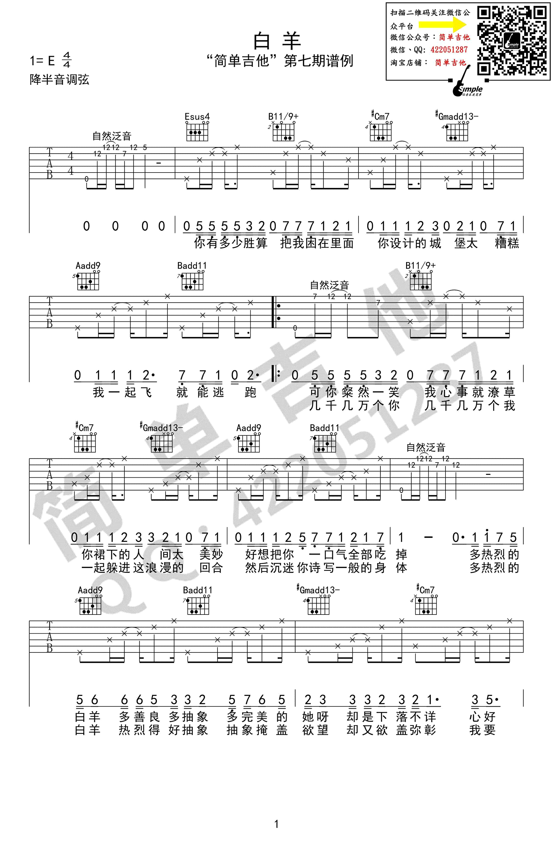 白羊吉他谱,原版完美弹唱谱,徐秉龙沈以诚演唱,E调降半音调弦,白羊六线谱,高清图片谱。感谢西安简单吉他编配,吉他吧网站上传。 慵懒的风格,有力的腔调,自信又矛盾的词句,这很白羊。一首热门的网络歌曲,清澈温暖的歌声唱成了一场倾诉,倾诉青春的欢喜而无望、懵懂却倔强。