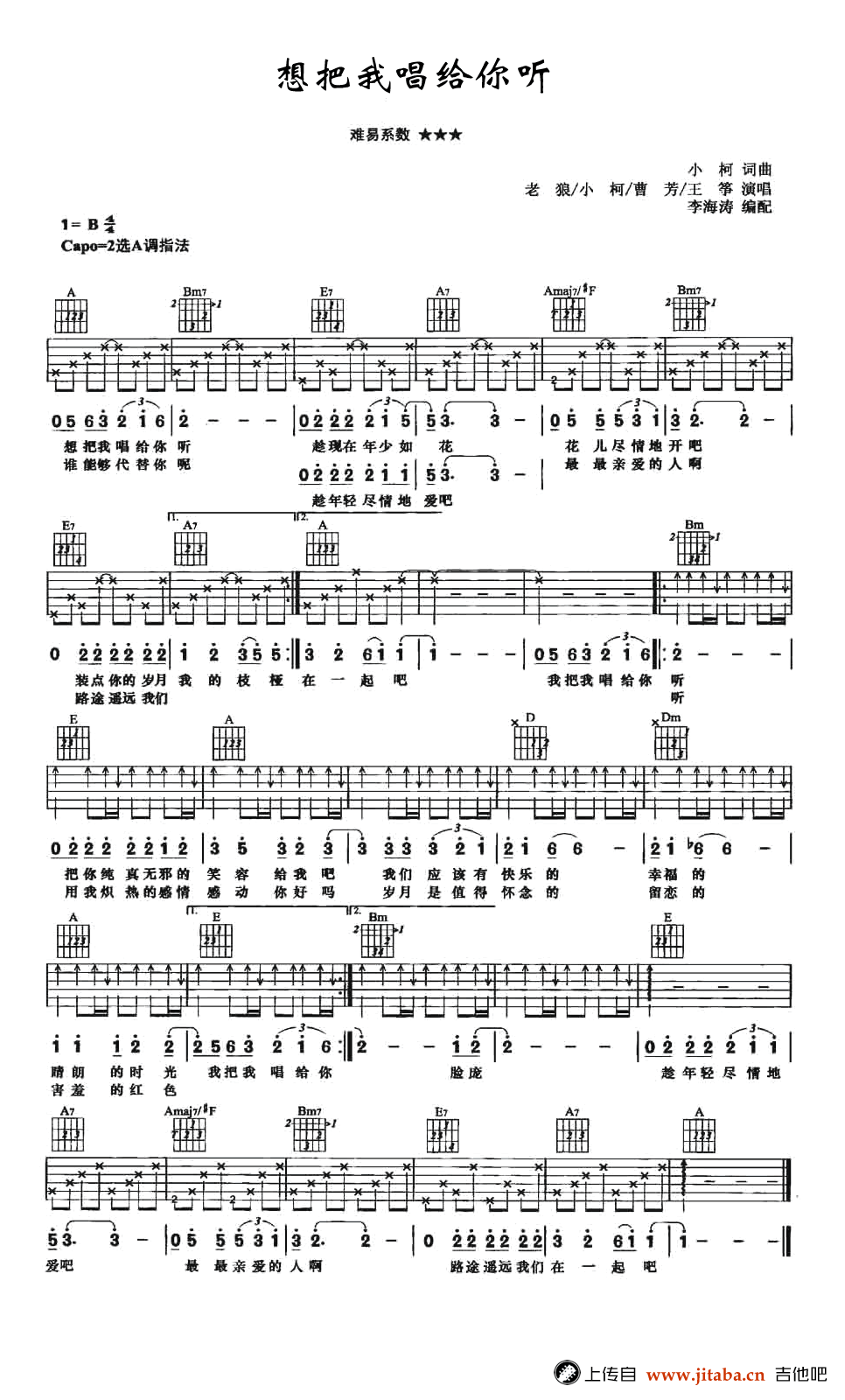 想把我唱给你听吉他谱,老狼的一首经典男女合唱老歌,原调B,CAPO夹二品,选用A调指法,想把我唱给你听吉他弹唱六线谱,感谢李海涛编配,难度系数三颗星,吉他吧网站上传。 老狼的歌是很多人青葱岁月的寄托,磁带里刻录着你我青春的喜怒哀乐。时光荏苒,情怀依旧。想把我唱给你听,趁现在年少如花,花儿尽情的开吧,装点你的岁月我的枝芽……唱得那么清纯那么撩心,你想听吗?