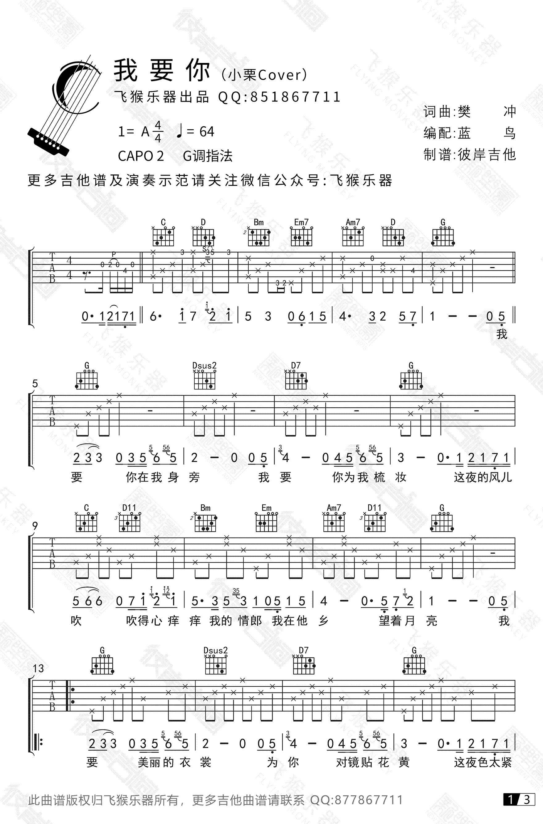 我要你吉他谱,电影《驴得水》主题曲,任素汐原唱的一首动听情歌,我要你吉他六线谱,高清图片弹唱谱,感谢飞猴乐器出品,这首歌曲的编配是在老狼和任素汐的两个版本的基础上做了简单的改编,A调用变调夹夹二品,G调指法难度不大,全曲没有大横按和弦。吉他吧网站上传收藏。随谱附上《我要你》吉他弹唱示范视频,小栗Cover,蓝鸟老师吉他。