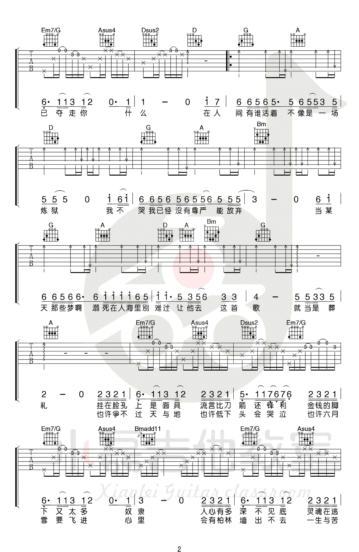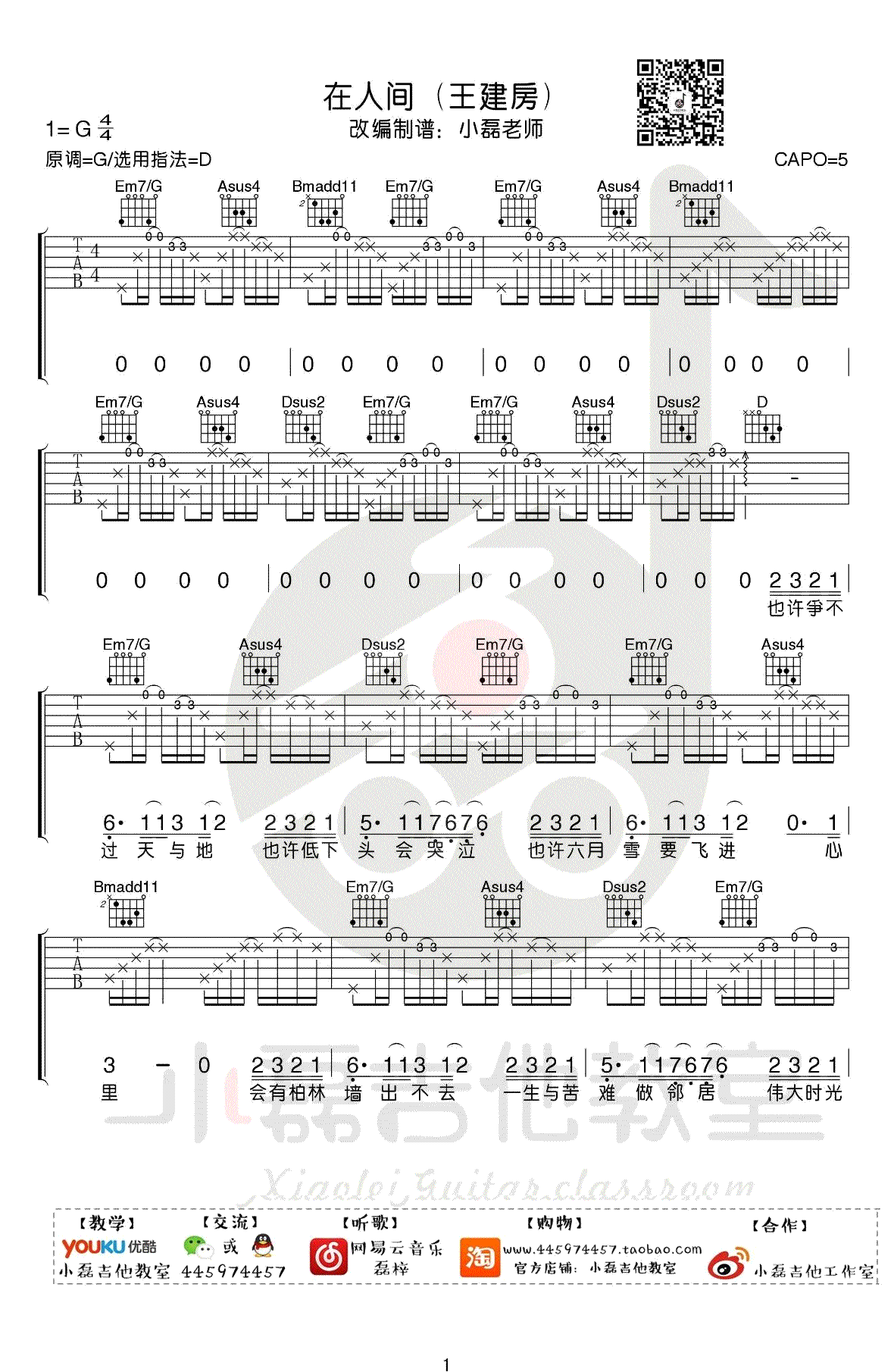 在人间吉他谱,王建房演唱,翻唱自一首感人的英文歌曲的《What are words》,在人间吉他弹唱谱,高清图片六线谱,小磊老师制作的这个曲谱是根据国语版改编的,原调G,选用D调指法编配,变调夹夹五品,编配参照原版的吉他走向,乐谱演奏成分还是很强的,难度七级,节奏基础不是特别好的琴友们需要多加练习。附上配套教学视频,大家参照弹唱演示和讲解示范进行学习。吉他吧网站推荐分享。