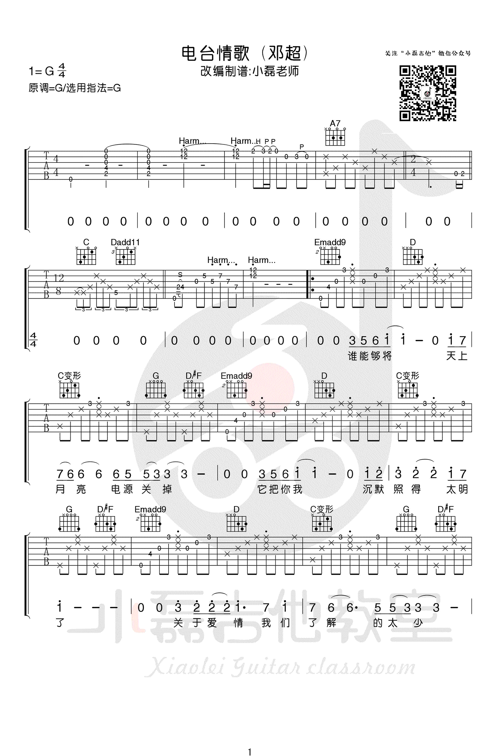 电台情歌吉他谱,G调指法,电影《从你的全世界路过》主题曲,邓超演唱版本,电台情歌六线谱,三张弹唱图片谱,感谢小磊吉他编配出品,吉他吧上传。电台情歌男生版,深情细腻的歌声,演绎翻唱莫文蔚的经典歌曲,一如在爱人的耳边低语倾诉,那些温柔的情话。 电台情歌前奏吉他教学视频: 电台情歌主歌间奏尾奏吉他教学视频: