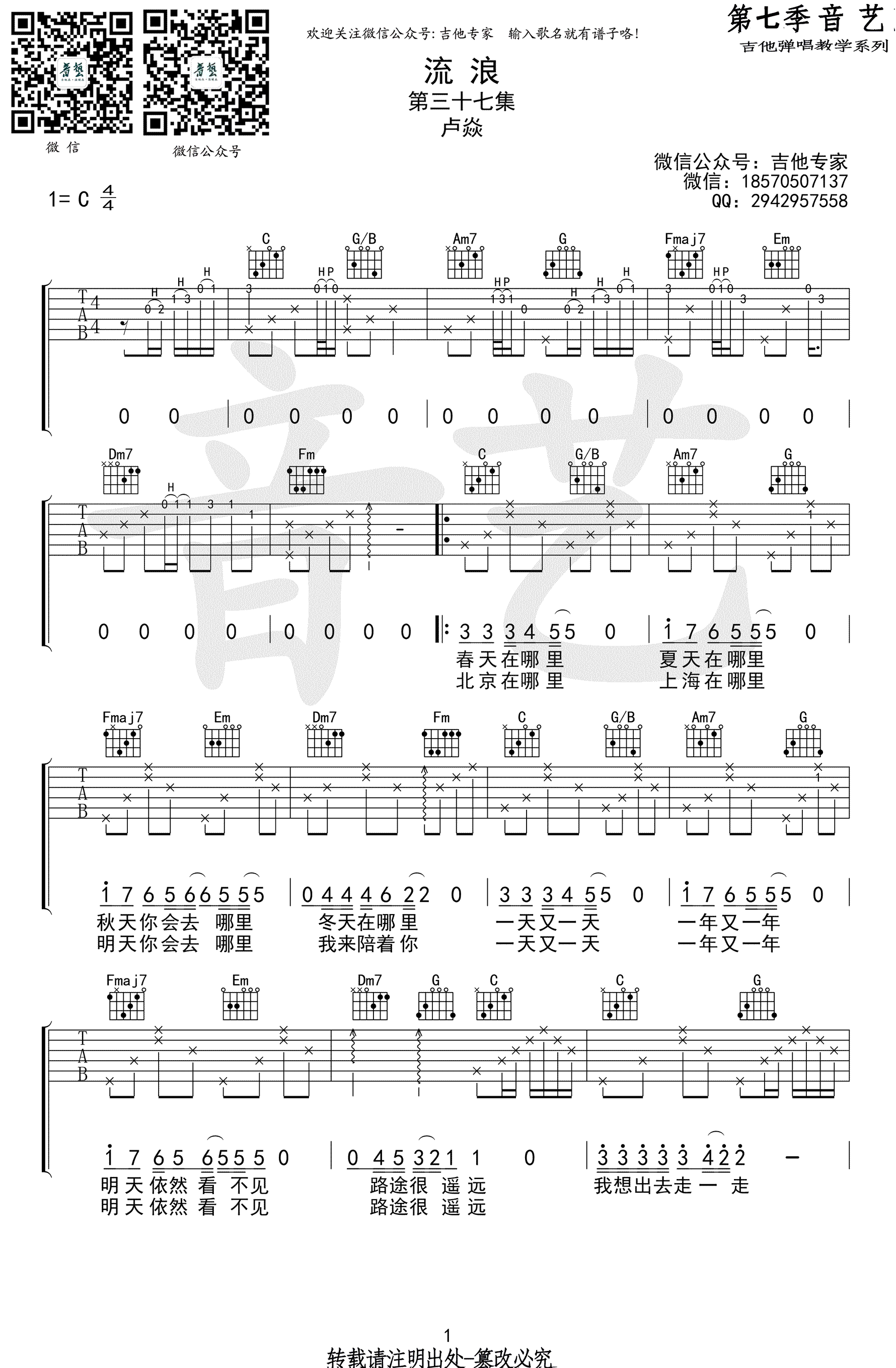 卢炎流浪吉他谱,C调弹唱,高清弹唱谱,一首好听的抖音热门歌曲,流浪六线谱,感谢艺音出品,吉他吧网站上传推荐。 羁绊的事情越来越多,怎样才能让自己过的洒脱一点,不知道最终是什么改变了我们,可能是不坚定,也可能是本来就特别容易妥协。我想出去走一走,看看这个大世界,还有太多的梦想等我去冒险。听着卢焱的《流浪》循环一遍遍,不要让自己被禁锢在原点。