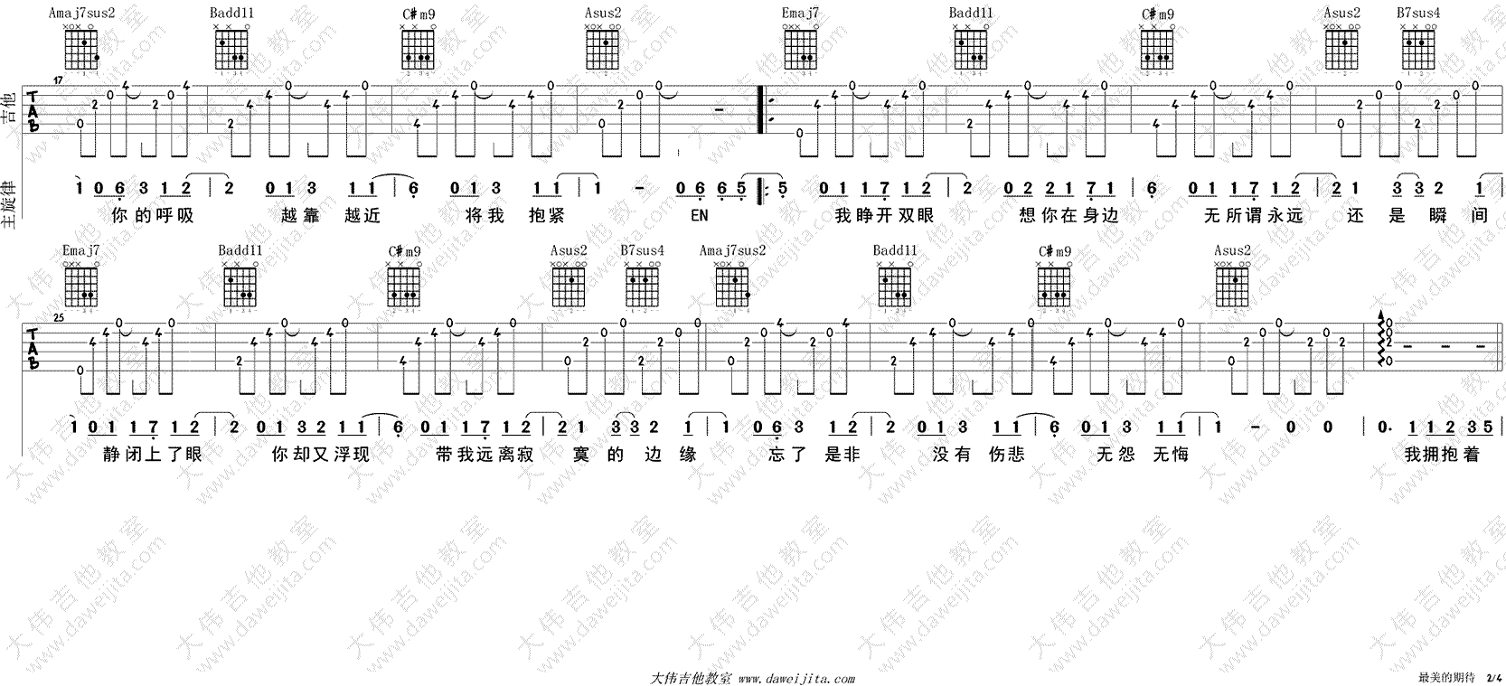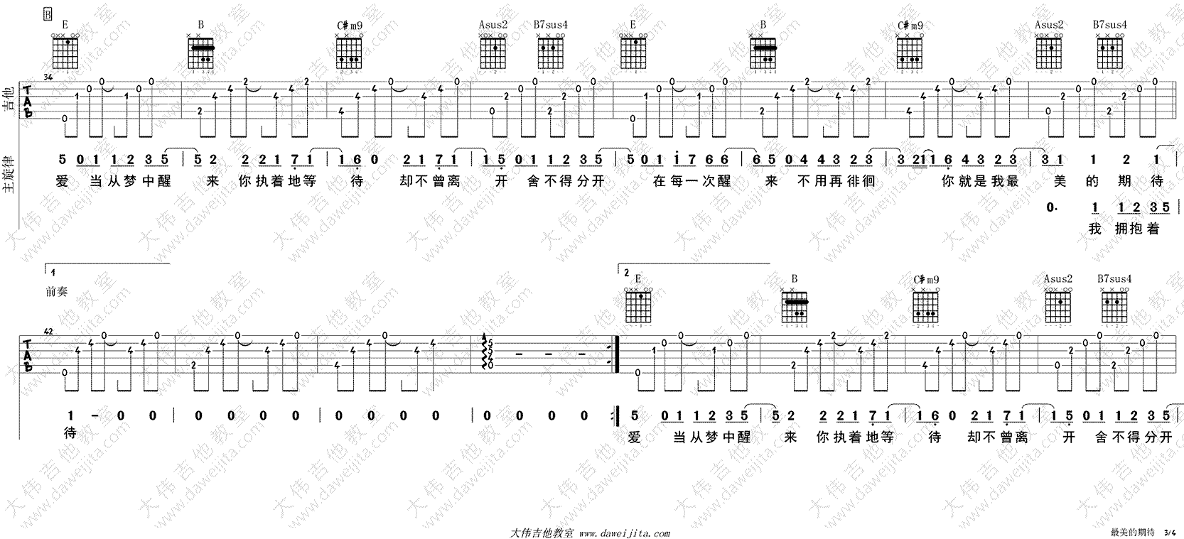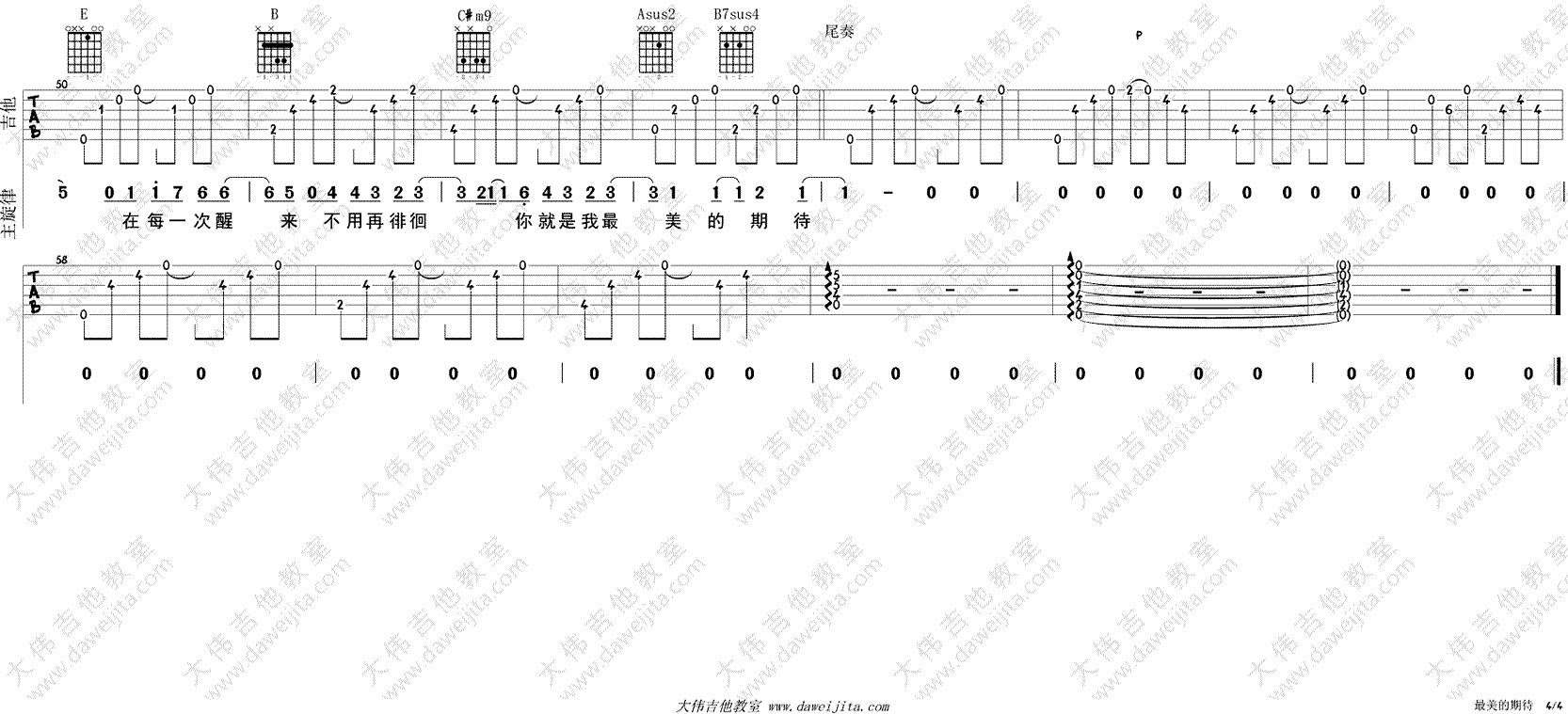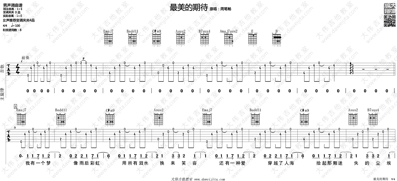 周笔畅《最美的期待》吉他谱,男生调曲谱,E调指法,女生推荐变调夹夹四品,最美的期待六线谱,高清弹唱图片谱,感谢大伟吉他教室编配,吉他吧网站上传推荐。随谱附上配套吉他弹唱视频,方便琴友们参照示范演示练习。你有你所期待的吗?你是在期待?还是在期待的已经如期而至?