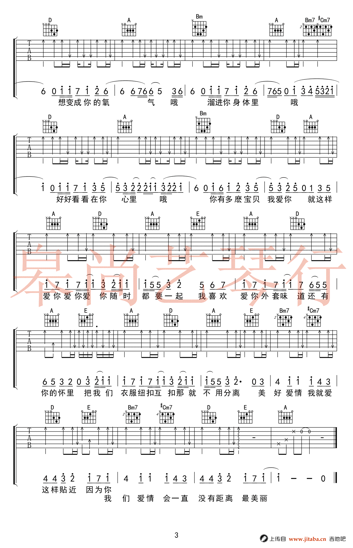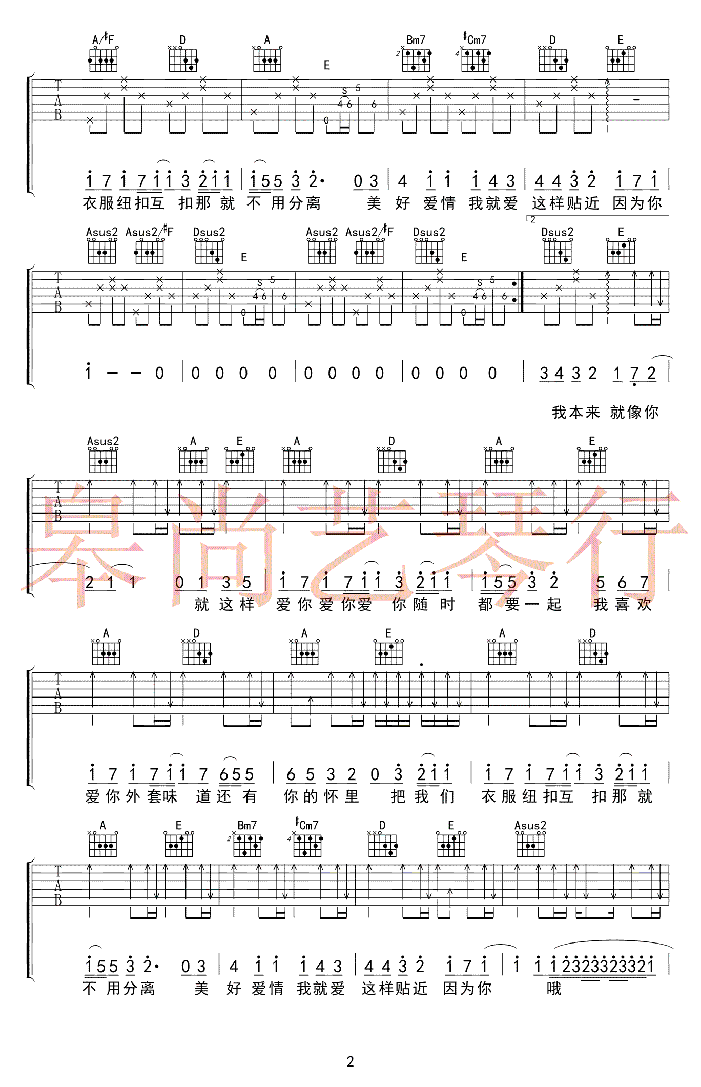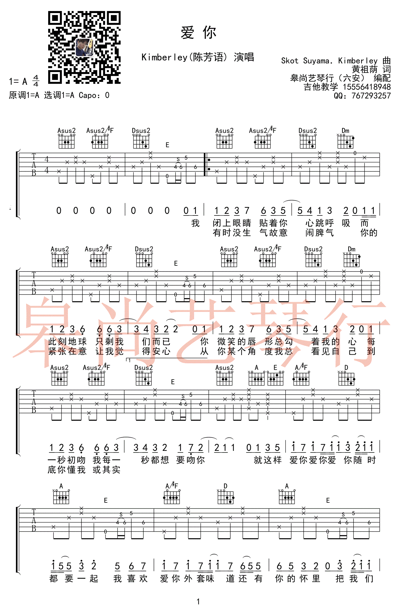 陈芳语《爱你》吉他谱,A调指法原版编配,高清弹唱谱三张图片谱例,一首清新甜美旋律动听的情歌,Kimberle陈芳语演唱,《爱你》六线谱,歌星皋尚艺琴行编配,吉他吧网站推荐上传。 台湾偶像剧《翻糖花园》的片尾曲,歌词简单而深刻,曲调悦耳动听,唱出简单美好的两人世界的情感。而陈以桐Jason Chen深情演绎则是最具代表性的男生翻唱版。