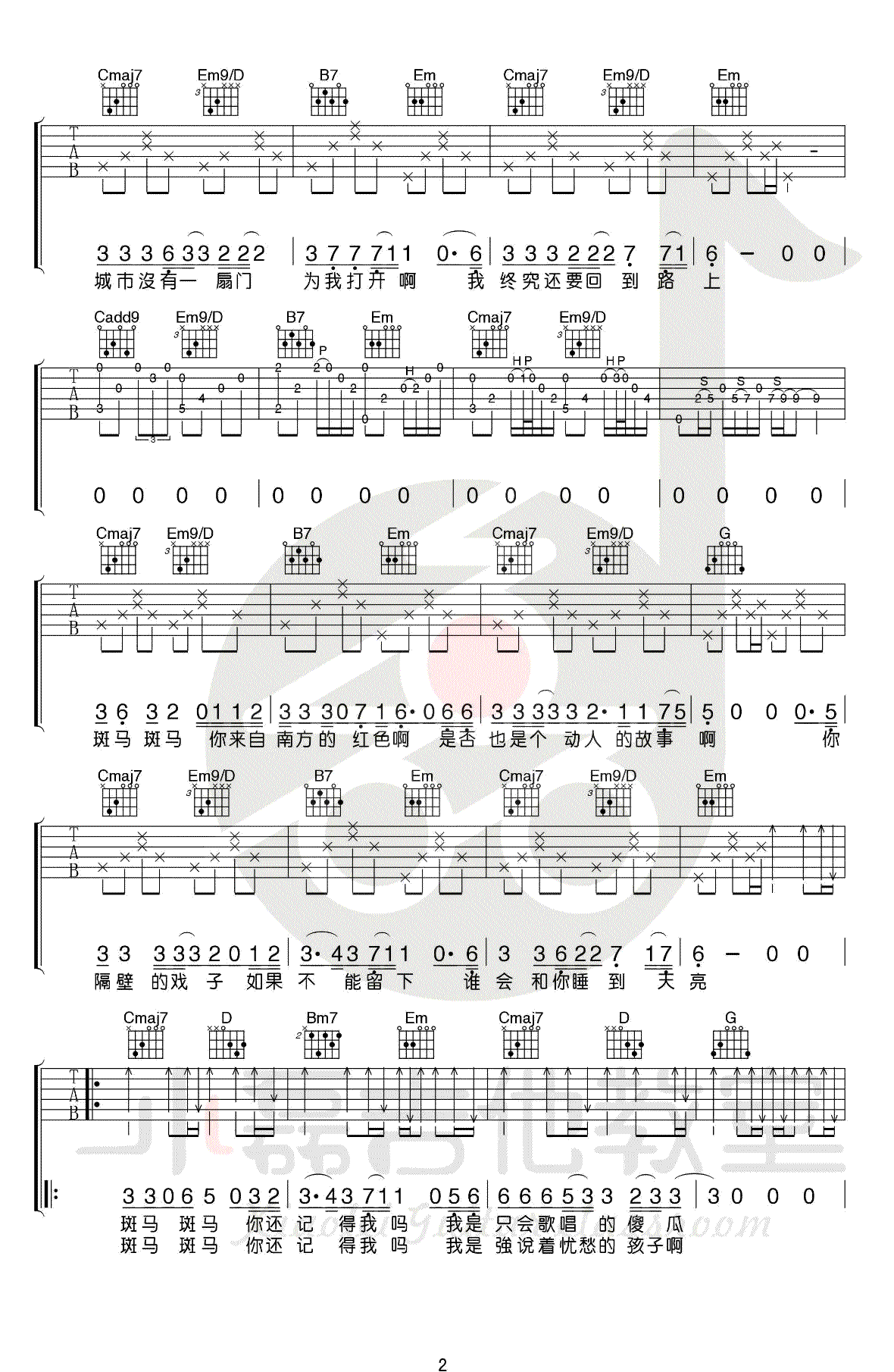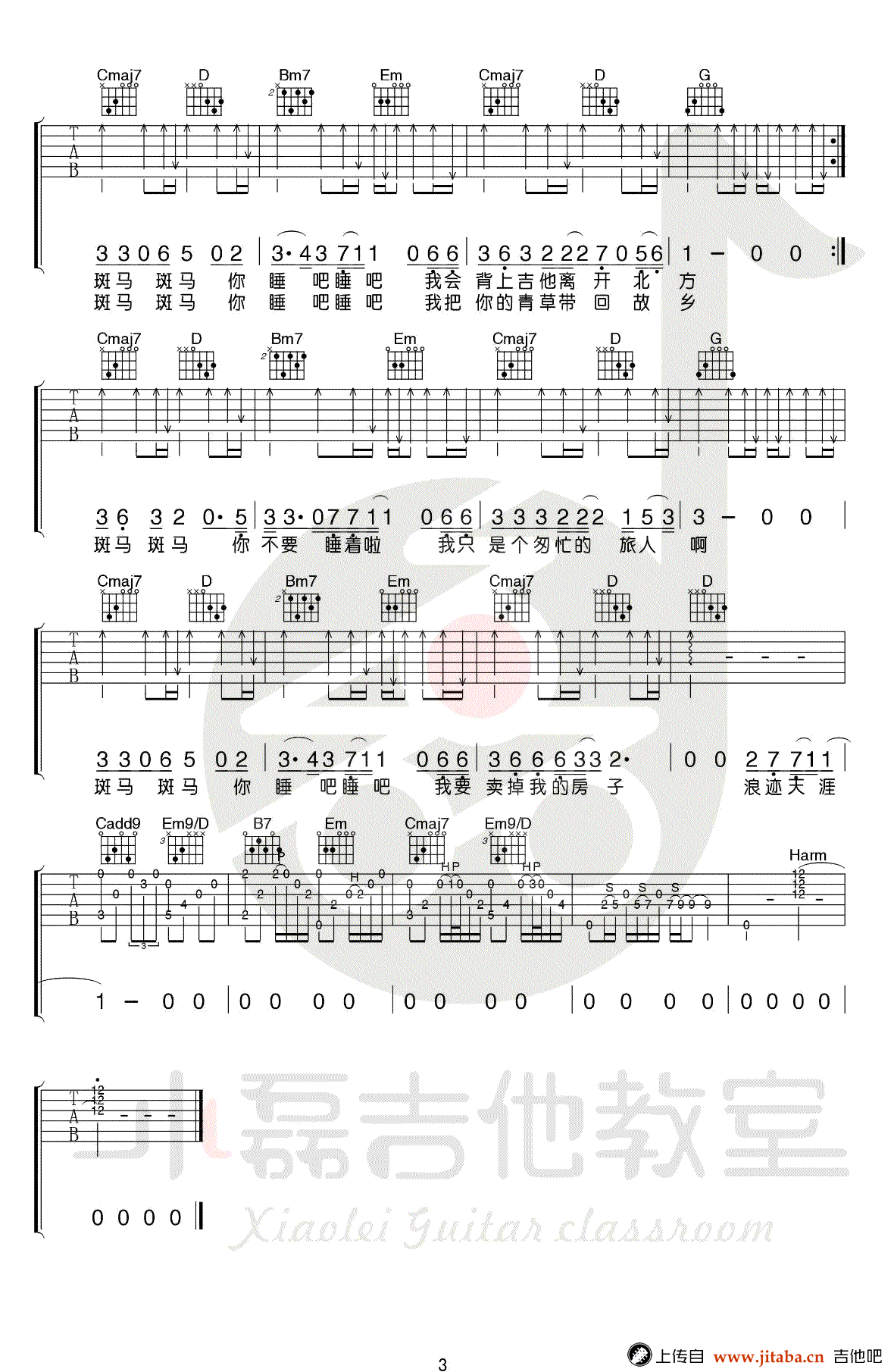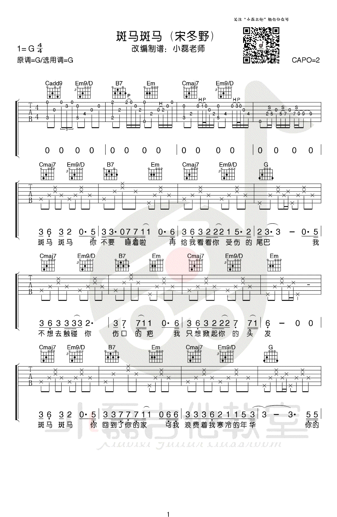 斑马斑马吉他谱,宋冬野经典代表民谣歌曲,G调指法,变调夹夹二品。斑马斑马六线谱,高清弹唱图片谱,配套吉他教学视频,感谢小磊吉他编配出品,吉他吧网站上传分享。 乐曲简析:这首《斑马,斑马》绝对算是民谣必备曲目了,最最可取的是原版大量的吉他演奏成分,大家可以练就熟练变成自己的拿手曲!小磊老师制作的这个乐谱的精髓在前奏和后段的扫弦,前奏部分可以说和原版一丝不差!后段的扫弦也可凸显歌曲的前后层次与气氛!难度:6级