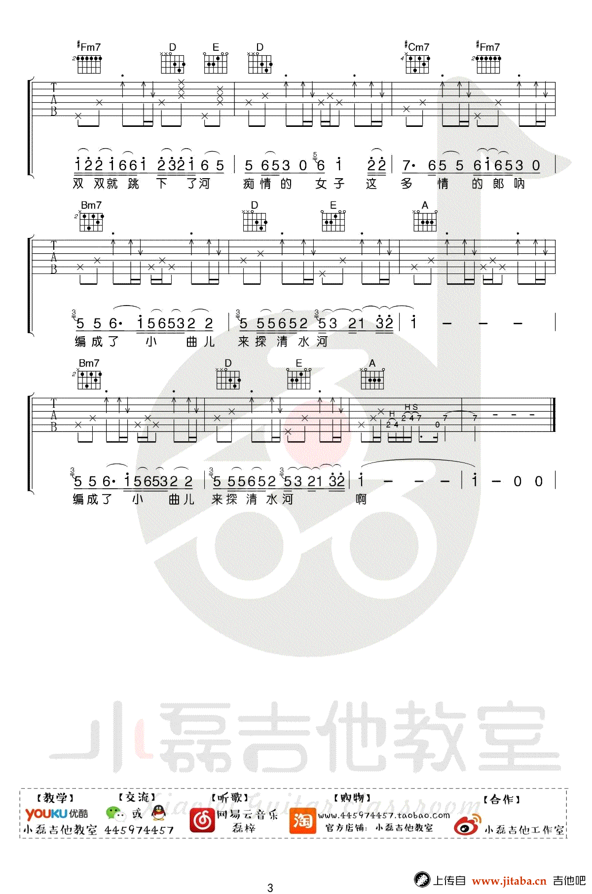探清水河吉他谱,一首在网络爆火的北京小曲,探清水河六线谱,高清弹唱图片谱,感谢小磊吉他编配出品,吉他吧网站上传收藏。 编配说明:最近大家可能对这首小曲儿不陌生了,随着张云雷在节目中的演唱,让这首非常有底蕴的曲目浮出水面,老师有幸制作了这个乐谱,根据的是晓月老板的版本,因为这个版本比较具有演奏性,整体色彩更浓烈! 前奏可能是最需要联系的部分,我们用到了A调指法,可能也会略微有点小难度,后段的扫弦加入了小拇指敲击面板,整体层次更加清晰! 难度:7级