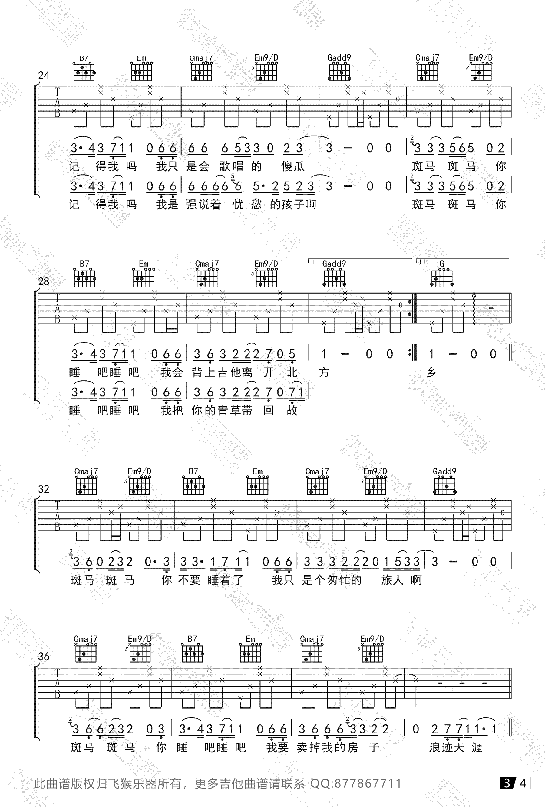 斑马斑马吉他谱,宋冬野经典民谣歌曲,G调高清六线谱,完整版四张图片谱,斑马斑马吉他弹唱视频,飞猴乐器出品,吉他吧网站上传推荐。学吉他,弹斑马。很多吉他初学者都练习的一首歌,幻想着“你睡吧睡吧…我只想掀起你的头发”……吉他弹唱《斑马,斑马》中间有solo哟。