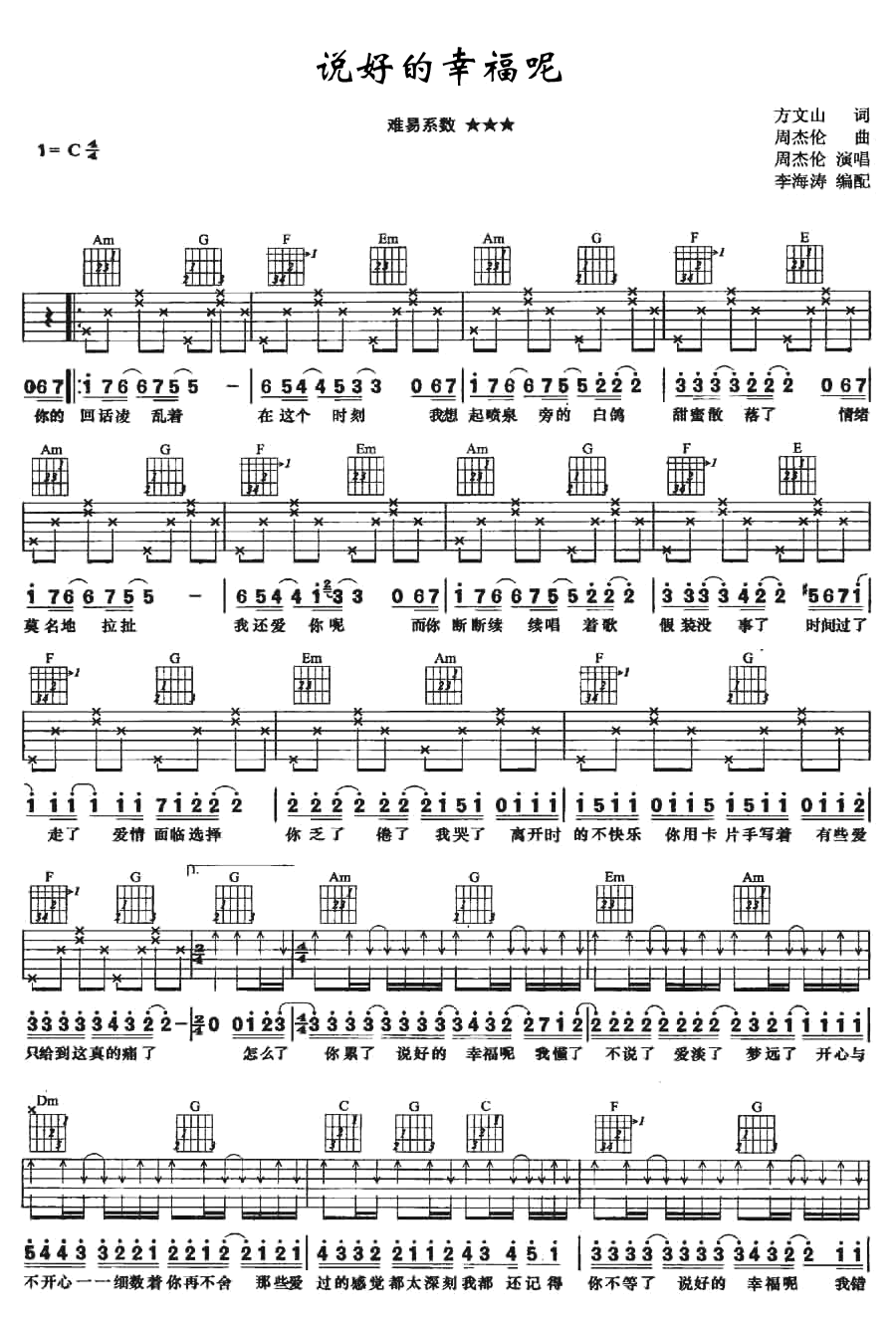 说好的幸福呢吉他谱,周杰伦的一首伤感情歌,C调指法,吉他弹唱图片谱,说好的幸福呢六线谱,感谢李海涛编配,吉他吧网站上传。 方文山和周杰伦合作的经典作品,唱出分手的惆怅和伤痛,说好幸福呢?你却说我们就走到这,而我的回忆的音乐盒还旋转着,要怎么停呢?让我们我们弹唱着周董的这首老歌,去追忆属于我们的青春吧。