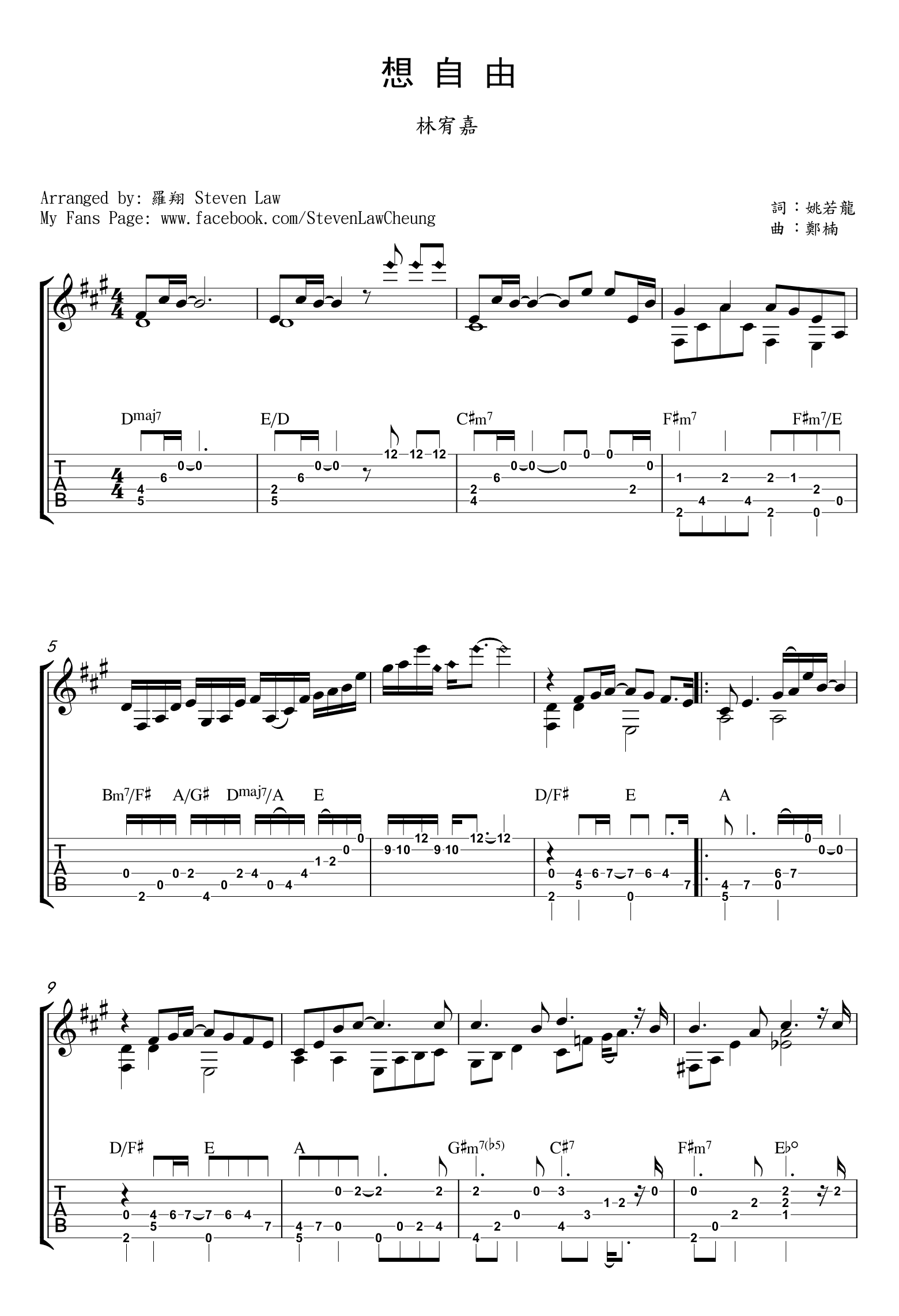 想自由吉他谱指弹版,根据林宥嘉演唱歌曲改编,想自由吉他独奏谱,三张高清图片谱,感谢罗翔老师编配,吉他吧网站为琴友们整理上传。 林宥嘉的很多歌也是满载着回忆,当熟悉的旋律再次响起,就一瞬间把我们拽回那个时候。想自由,郑楠谱曲,姚若龙填词,收录在发行的专辑《美妙生活》。该歌曲也是电影《我的灿烂人生》的插曲。