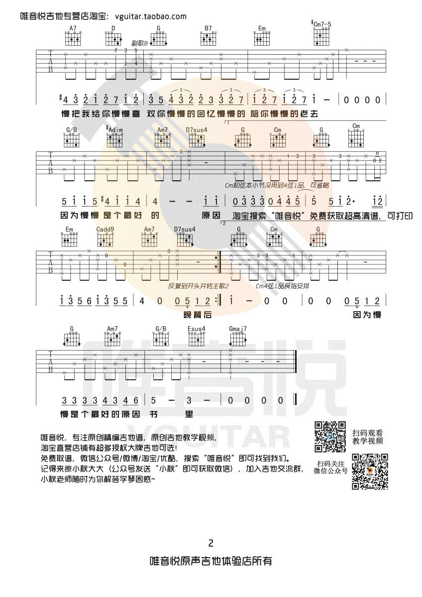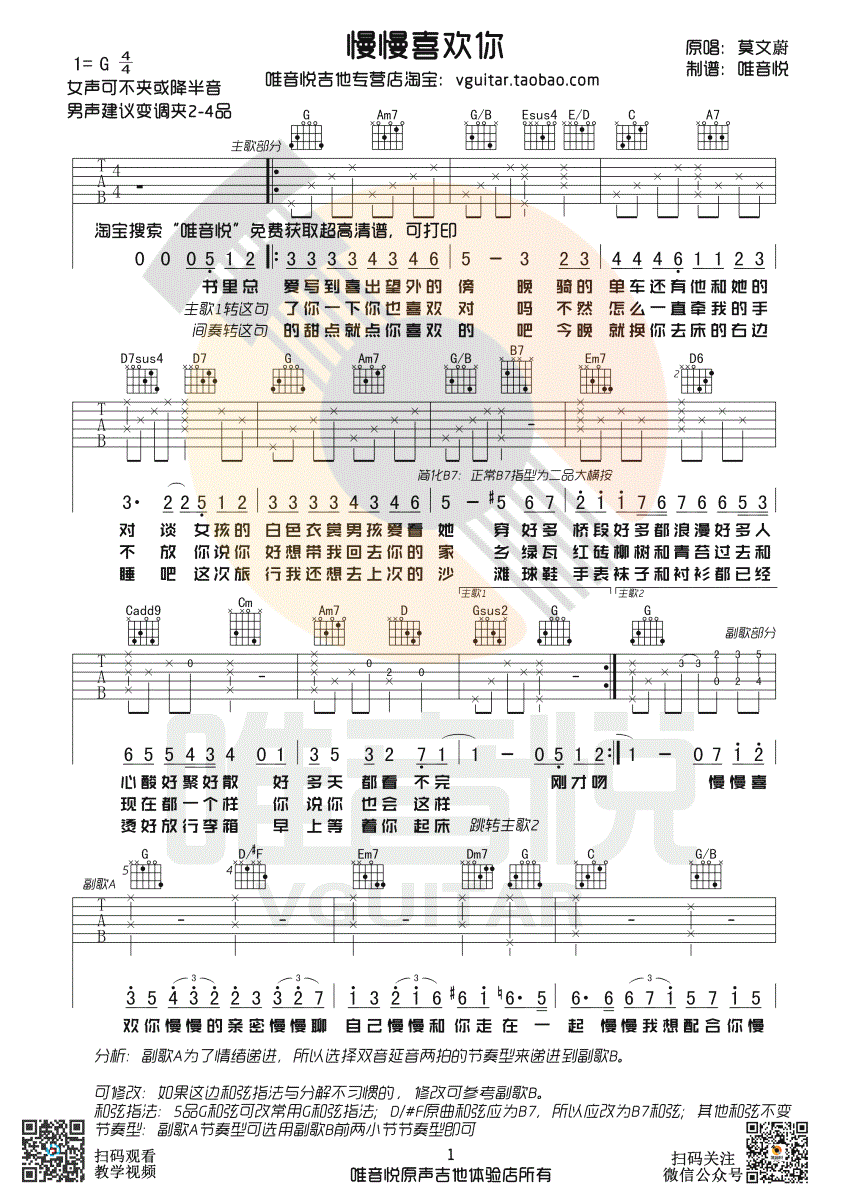 慢慢喜欢你吉他谱,G调弹唱谱,莫文蔚演唱的一首好听的情歌,慢慢喜欢你六线谱,女生不夹变调夹或降半音调弦,男生建议变调夹夹2-4品。感谢唯音悦编配, 编配提示:副歌部分有改了一些,也是为了让主歌的情绪到副歌有个缓冲。层层递进,这样的情感表现会更加细腻一些。有时候不是因为需要编的很丰满才好听,简单也可以很有味道,所以副歌A部分如果大家高把位有点难的话,可以直接沿用副歌B的节奏型哈,谱子里面有标记了怎么改哦。