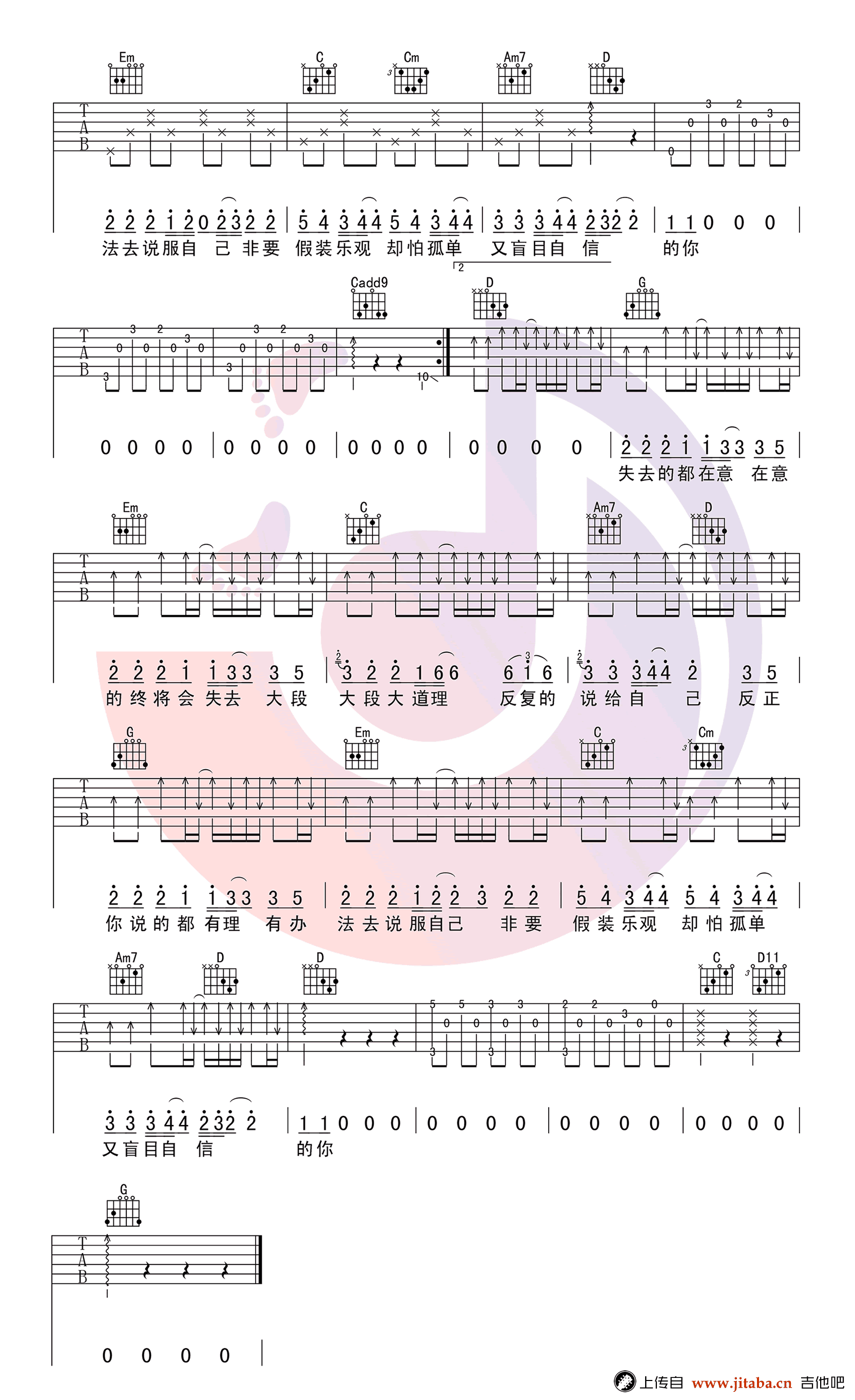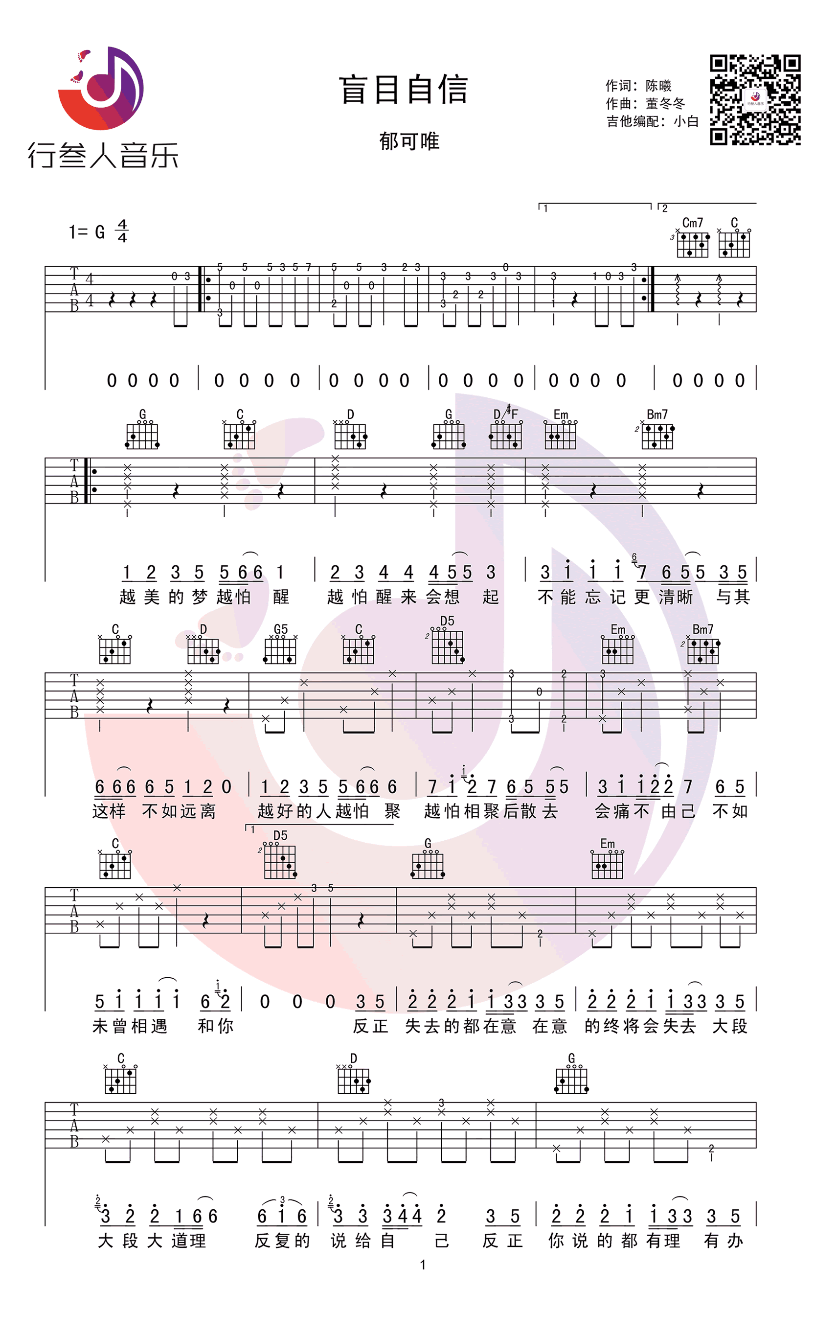 盲目自信吉他谱,电视剧《谈判官》主题曲,郁可唯演唱的一首动听的情感歌曲,盲目自信吉他弹唱谱,六线谱高清图片谱例,行叁人音乐编配出品,吉他吧上传。 郁可唯歌声细腻温暖,将爱情中的体会与感悟娓娓道来,爱就用尽全力爱,至少不留遗憾,送给那个假装乐观却又怕孤单、盲目自信又故意装傻的自己。