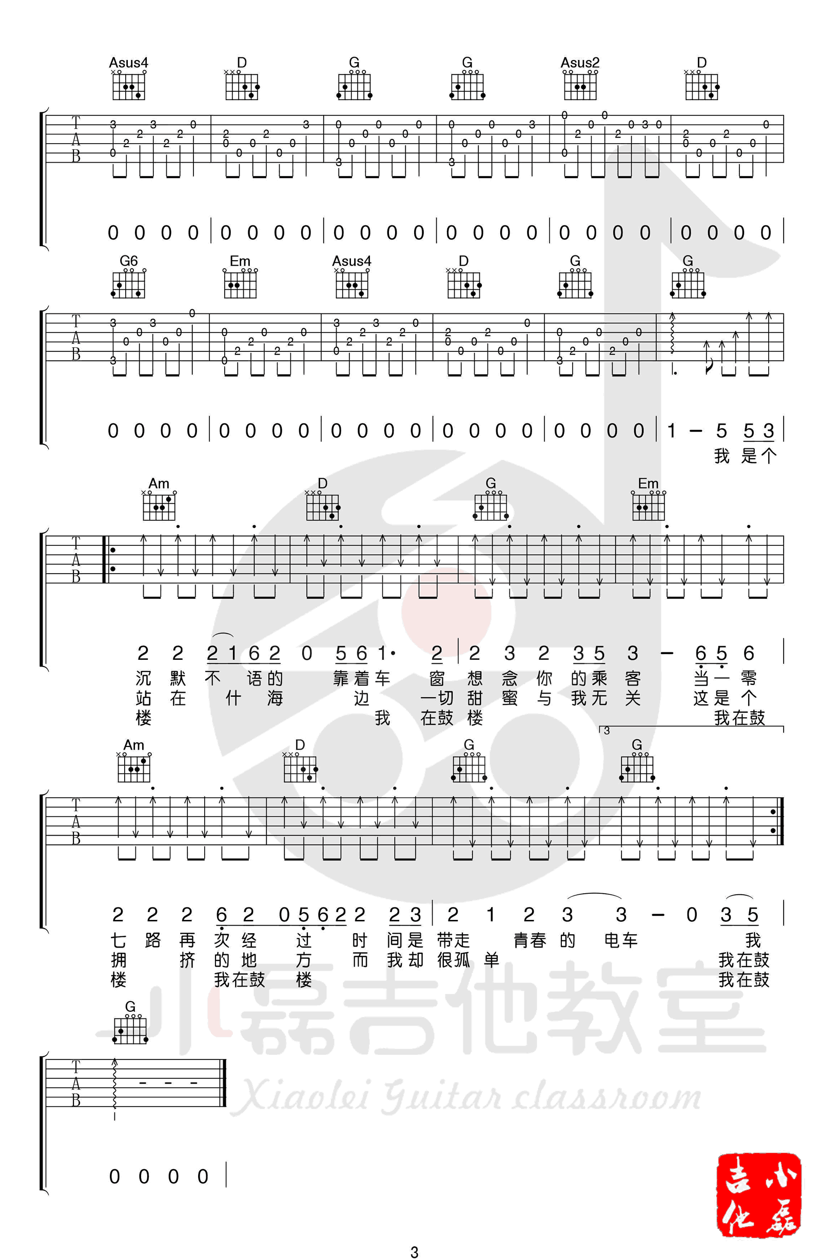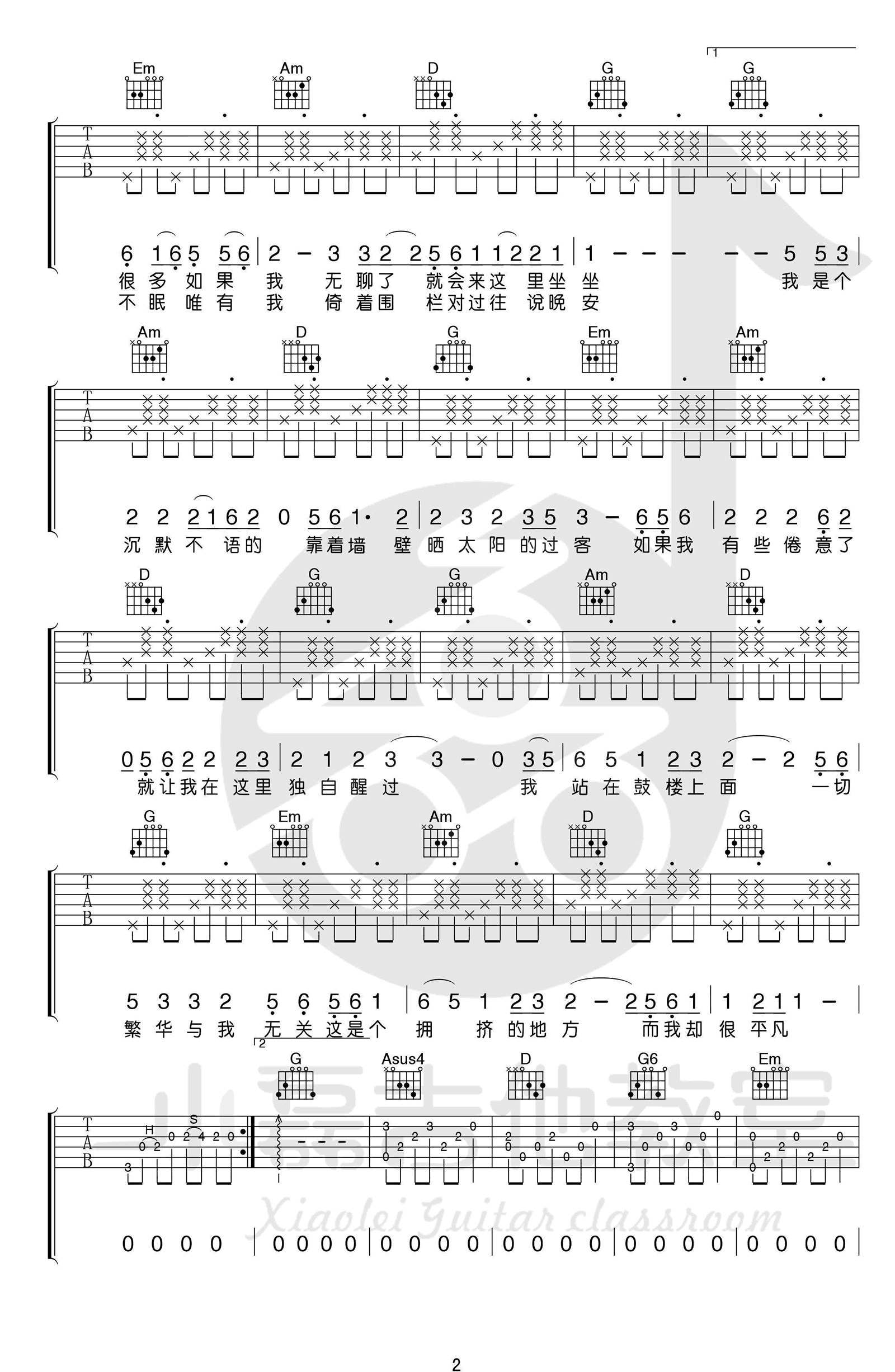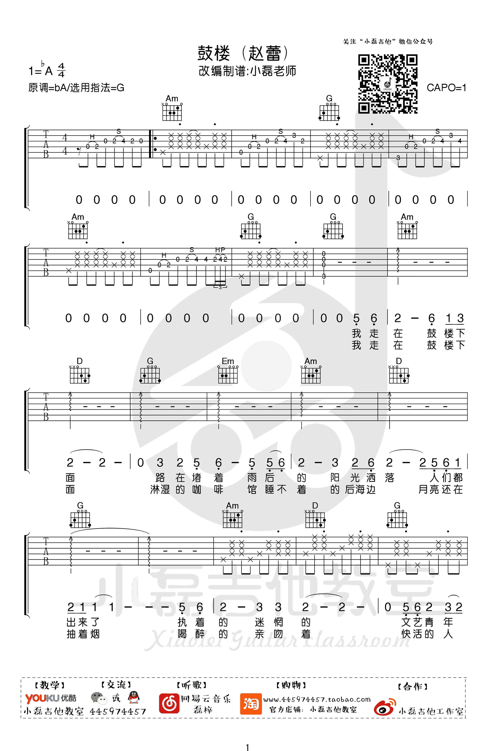 鼓楼吉他谱,赵雷演唱的一首民谣弹唱歌曲,成都吉他六线谱,原调bA,选用G调指法,男生变调夹夹一品,女生推荐第四品或五品位置,曲谱为打板+扫弦节奏版本编配,感谢小磊老师为大家带来《鼓楼》吉他弹唱教学视频,大家跟随讲解示范练习。